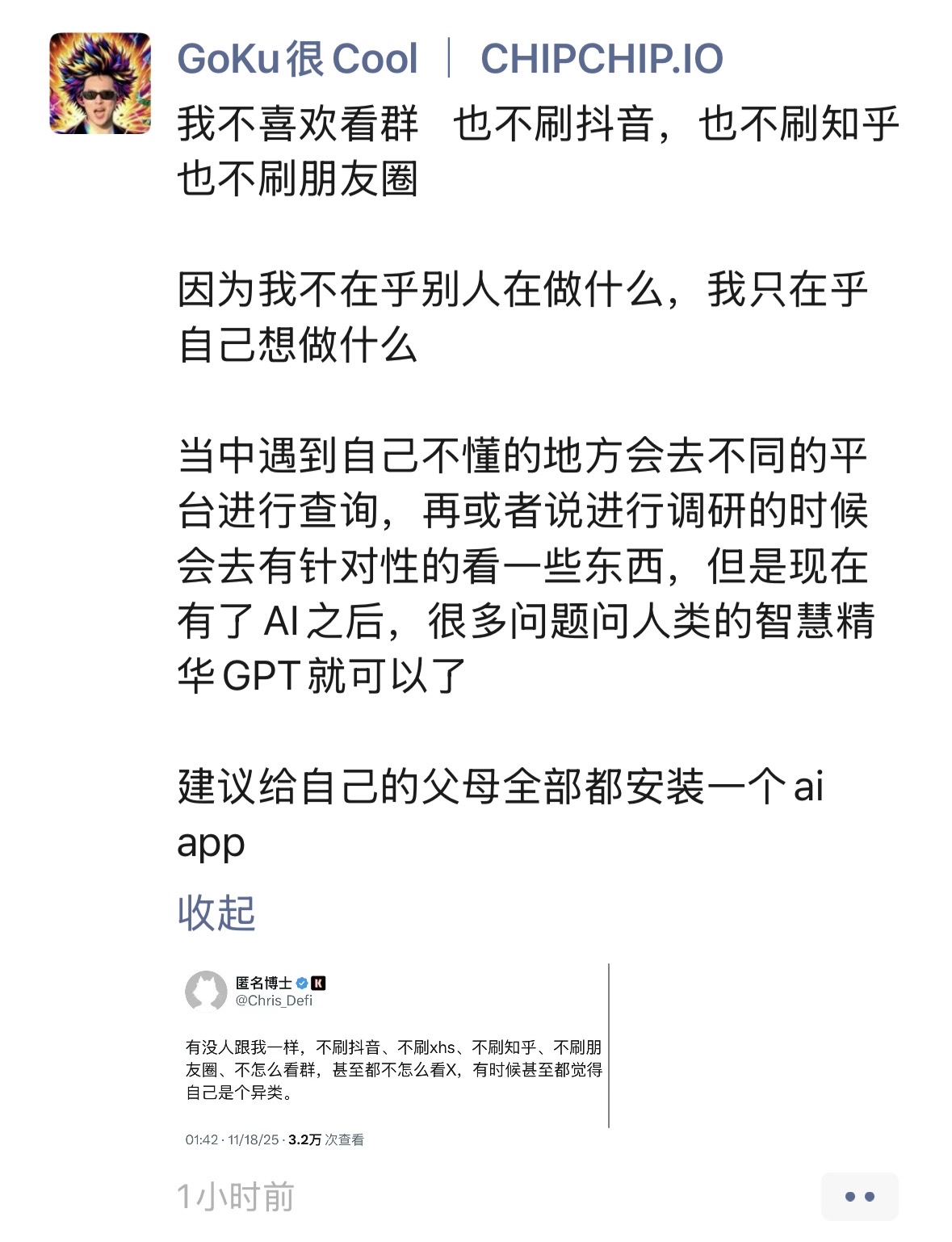 对我而言,体验过高爆发的「顶峰态」的极致爽感,会觉得「坠落态」太痛苦了,强烈想改变这种「非常态」。但ChatGPT老师一语点醒梦中人:正因为有高效率高耗能的「顶峰态」,才有宕机的「坠落态」,如果我的目标是长期稳定持续运行,那么「顶峰态」和「坠落态」都是「非常态」,要建立一个「中间态」,同时出现「顶峰态」时不要沾沾自喜,要警惕并强制自己停下来。