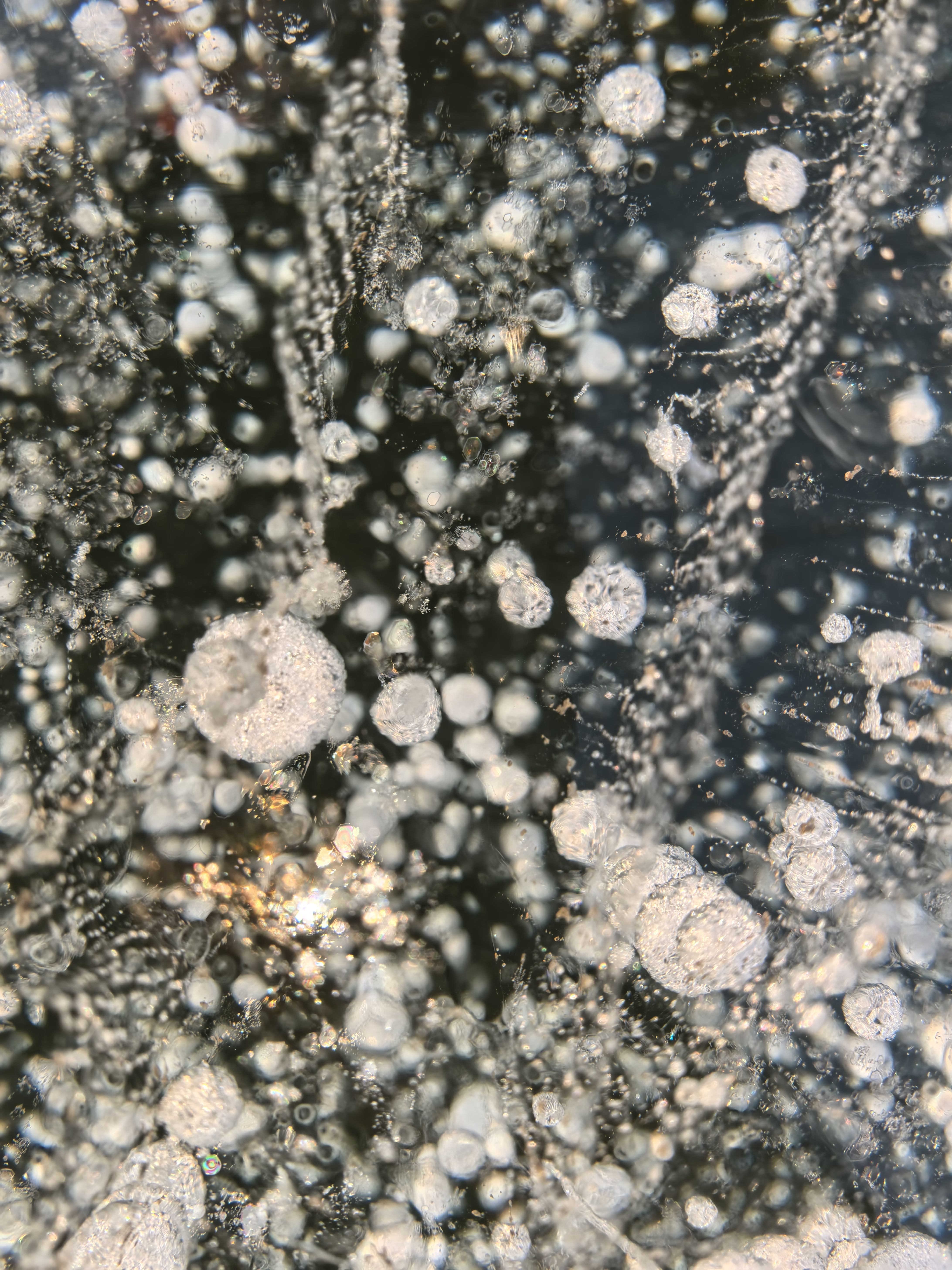 冰面下攒着一簇簇圆滚滚的气泡,像是被寒冬突然攥住的呼吸,凝在透明的晶格里。它们挤挤挨挨地团成棉絮似的模样,把水流晃动的瞬间、风掠过水面的声响,都封进了这方冰域里。这是冬日独有的定格,把流动的温柔,变成了触手可及的冰白童话。