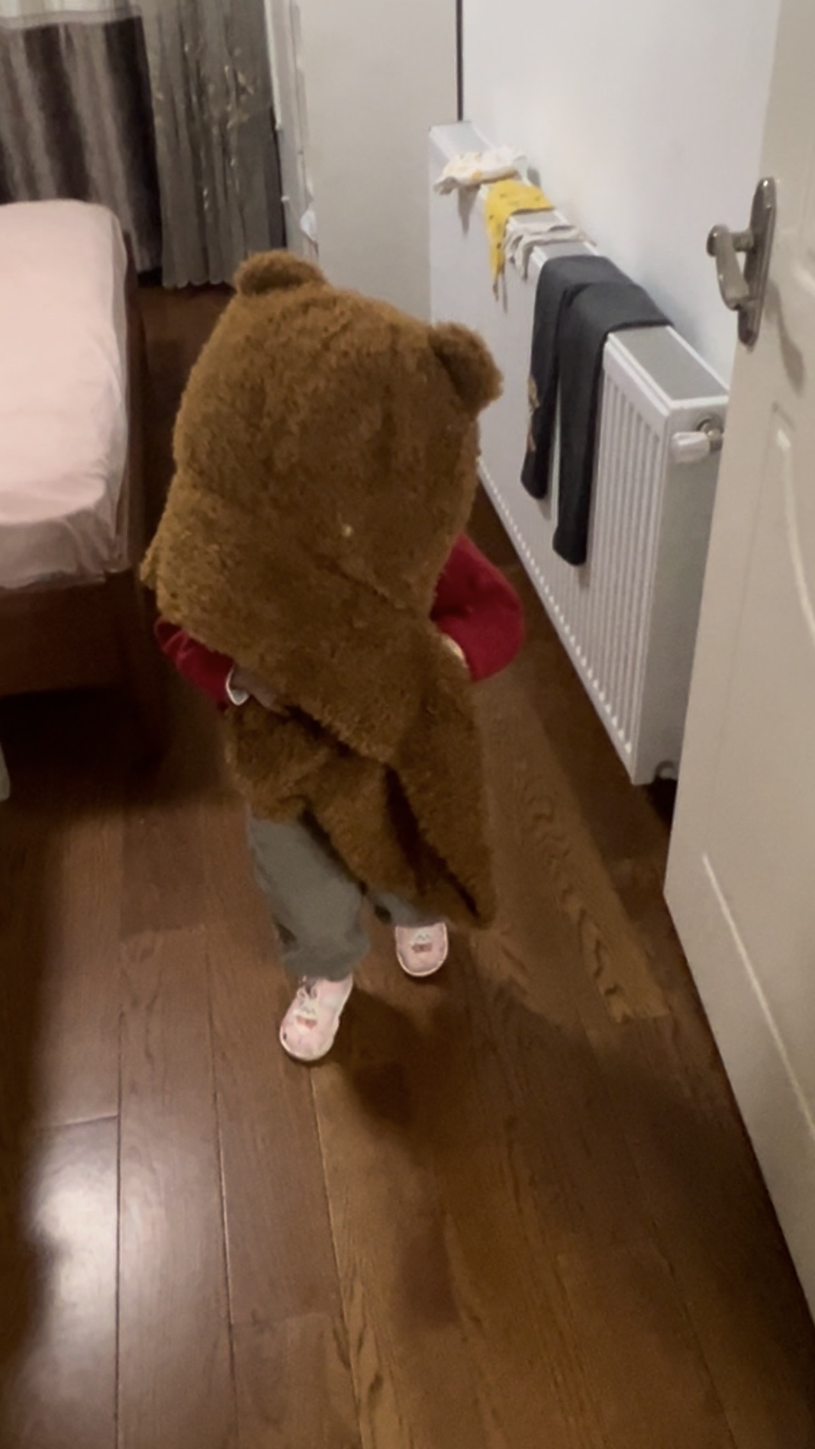 我:立刻把她脚底朋友送的熊熊帽子递到她手上。