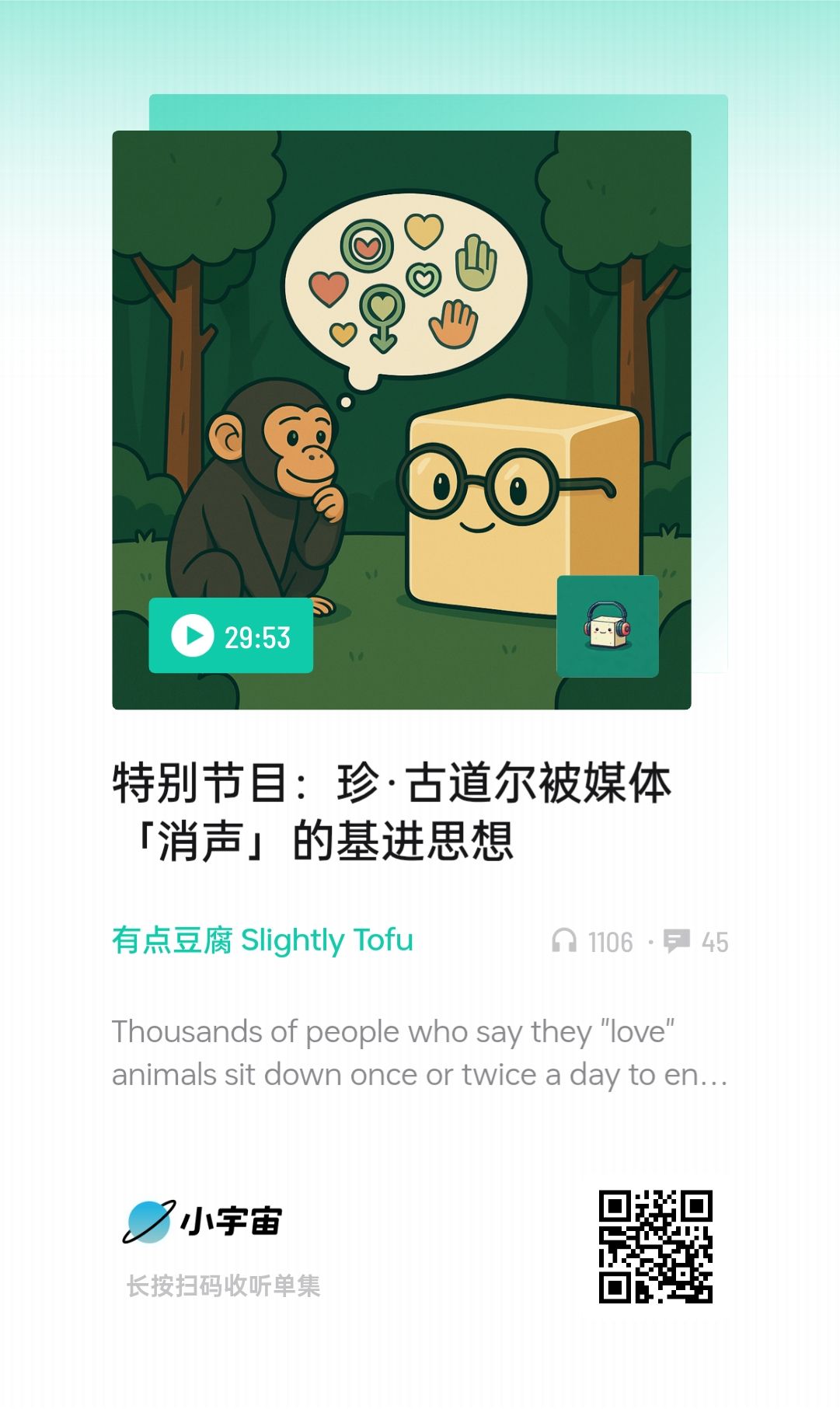 还有个点,其实我对珍古道尔的感受一直很模糊……后期她将工作重心转到公众倡导,关心、了解、行动、保持希望,但到底指向哪些行动呢?信息偏偏在这里留白。对我来说,落点不够具体,满满的行动力量就打在空气里,很可惜。我是在播客里补上这块缺失拼图的:“在大量的纪念报道中,她的一个关键主张被「消声」了:作为一名严格素食的倡导者,她对动物的爱并非停留在抽象层面,而是落实于「不消费、不伤害」的伦理选择。她反对工业化养殖以及动物实验,也并不认为人类的利益先于野生动物。”“珍古道尔的核心遗产是颠覆人类中心主义。”