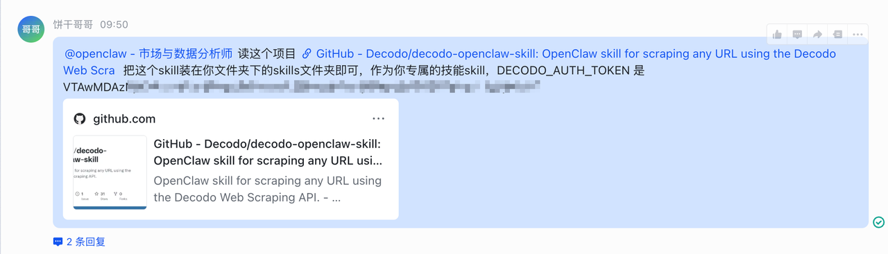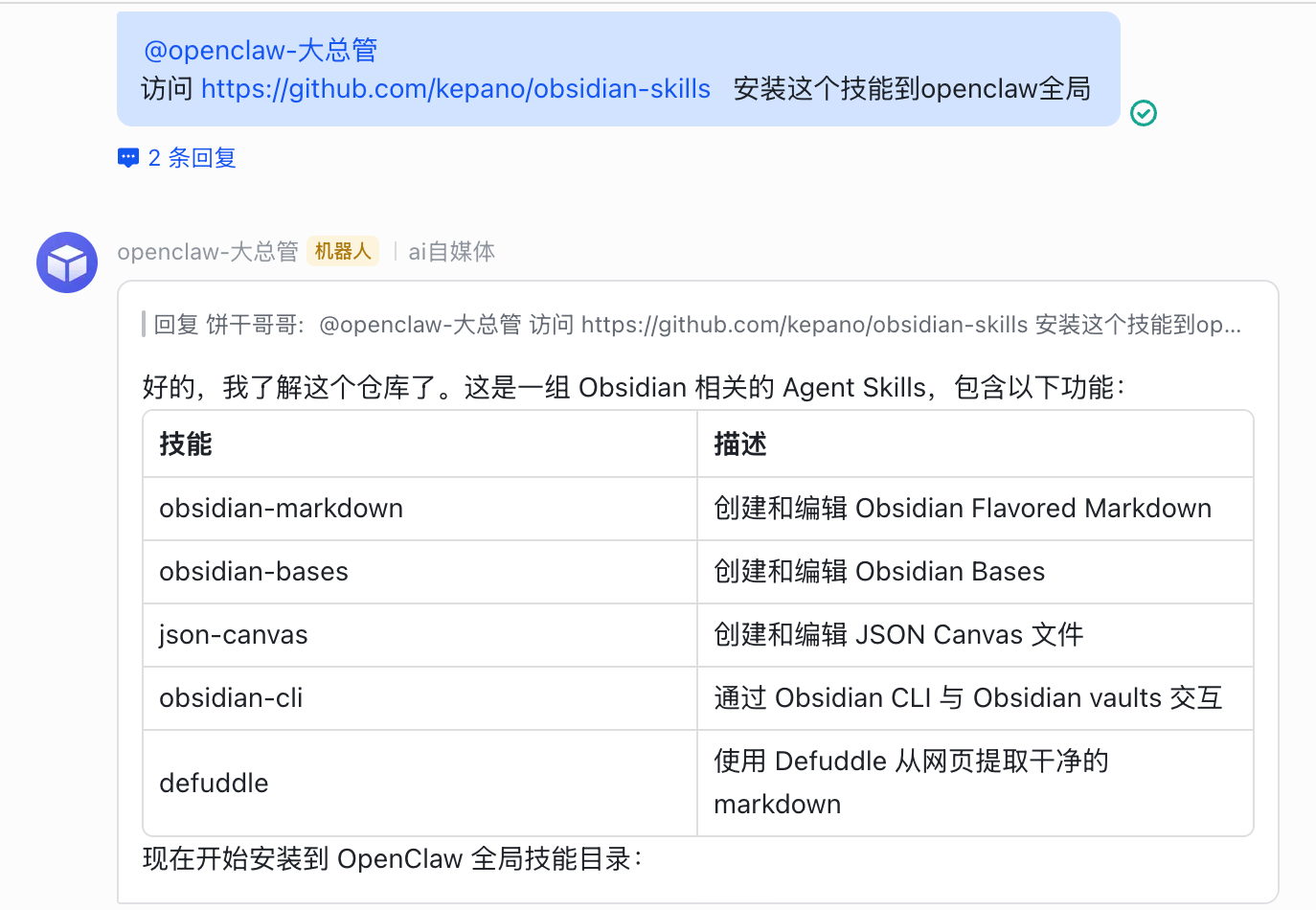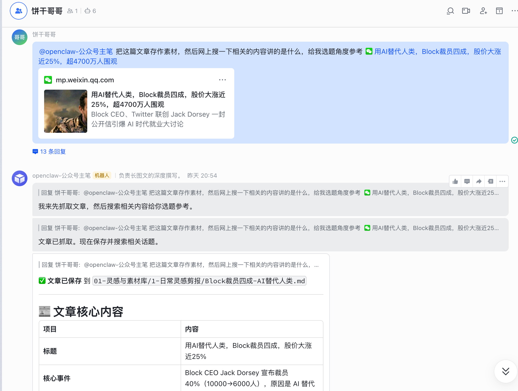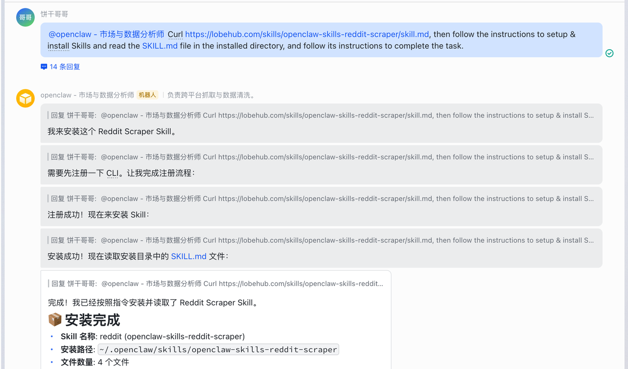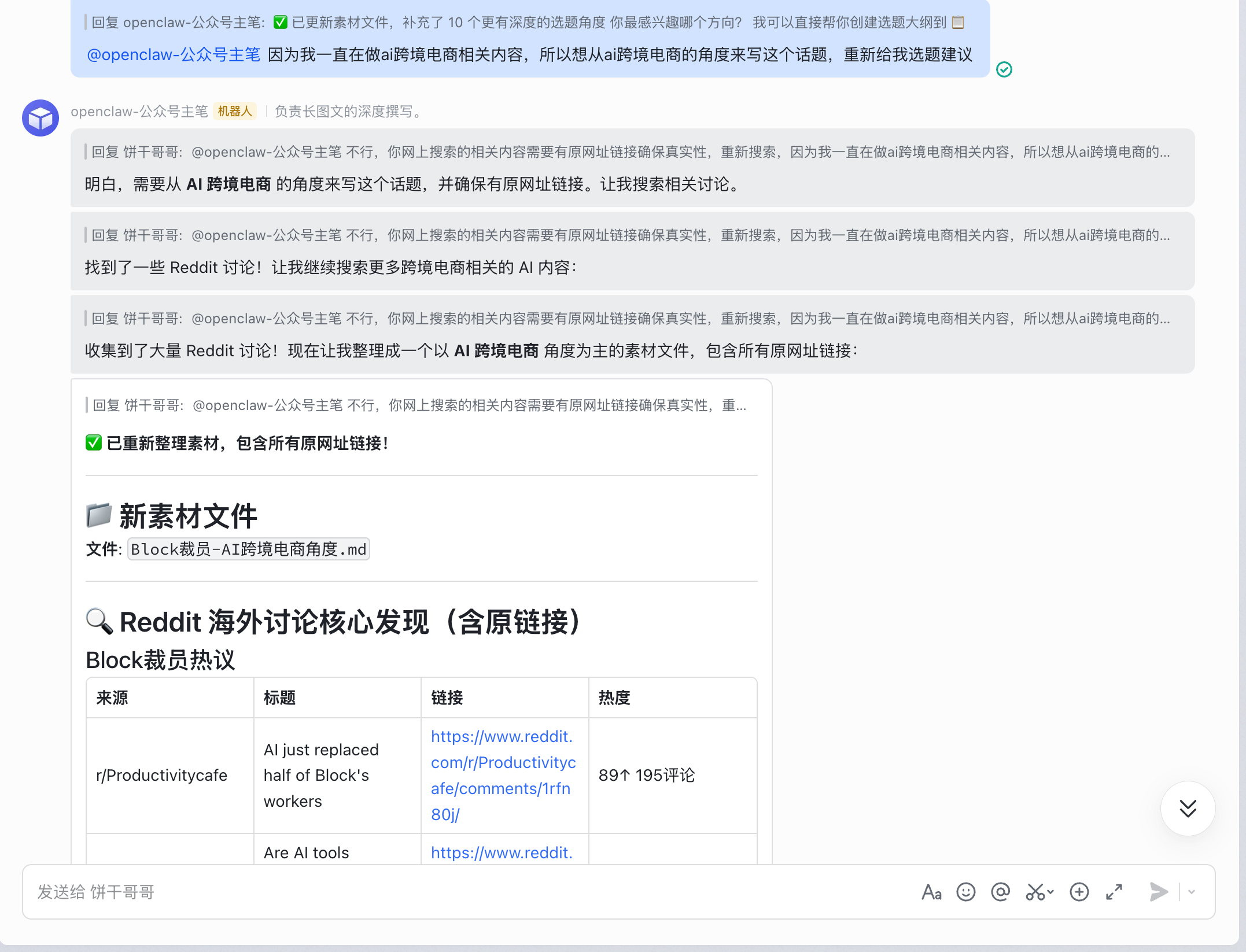 1. 触发任务:在飞书群里 @大总管:“分析一下露营折叠床的市场,并全渠道铺内容。”