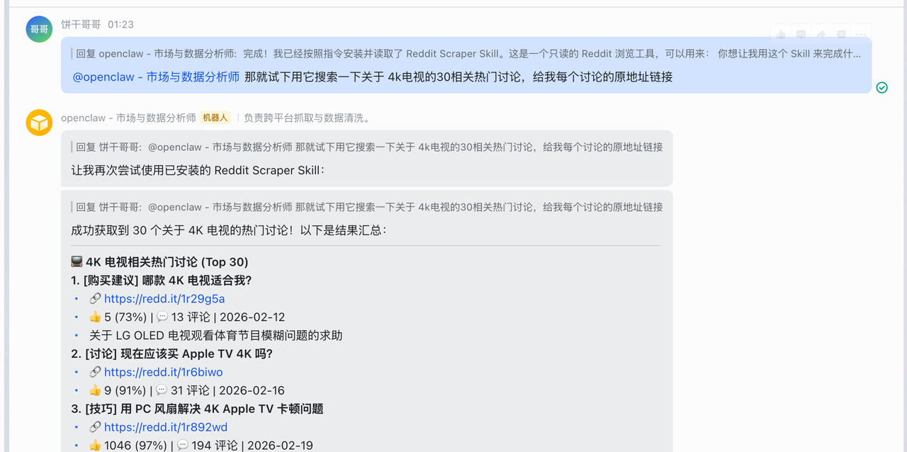 4. Reddit流量劫持:大总管同时唤醒 reddit-spec。它去Google搜索老帖子,找到排名靠前的相关讨论帖。在老帖子下真诚评论,推荐我们的新款,强调其解决了老款的痛点,成功劫持长尾流量。