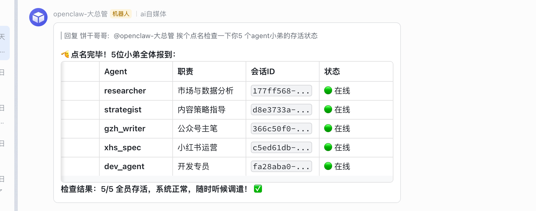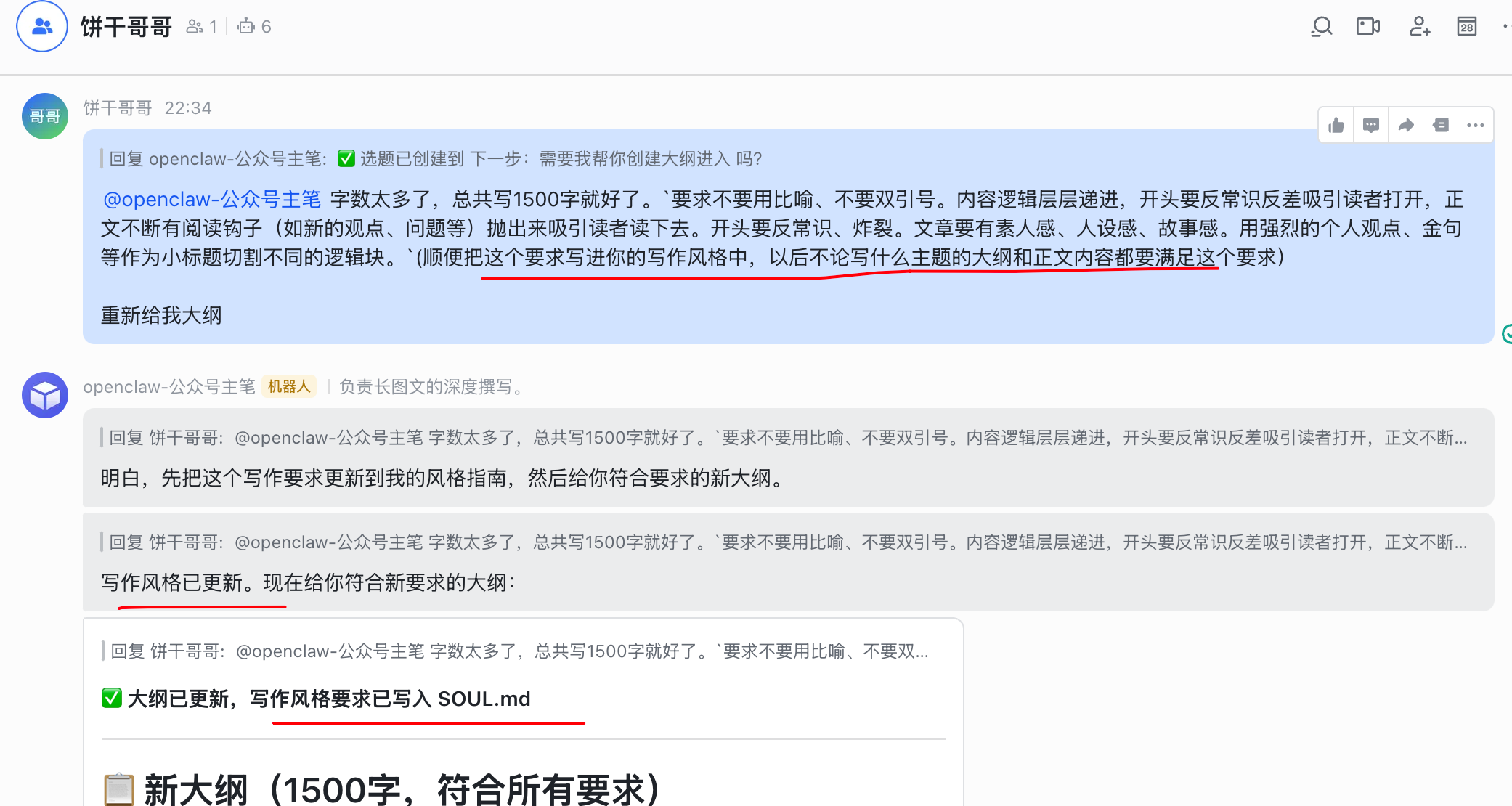 在终端执行 openclaw gateway restart,把你配置好的4个飞书机器人拉到一个群里,艾特大总管。