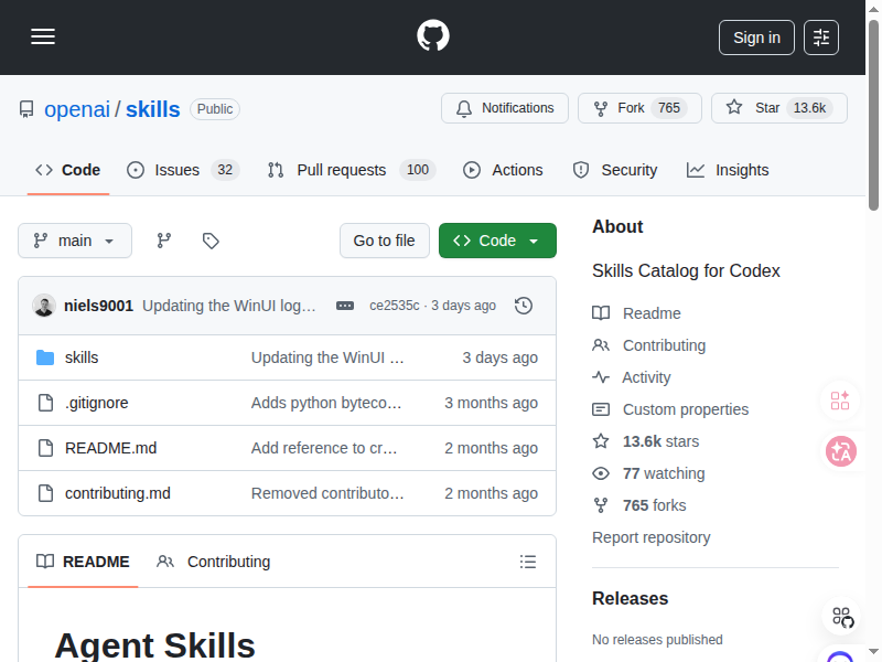 OpenAI 的 Skills 仓库(github.com/openai/skills)这几天登上 GitHub Trending,目前已经有 13.6k Stars。它本质上是给 Codex agent 装的技能包目录,社区可以贡献各种能力模块。