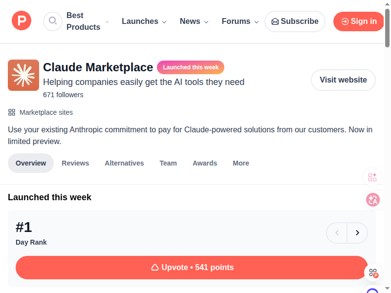 而 Anthropic 的 Claude Marketplace 刚在 Product Hunt 上拿到 Day #1(541个赞),定位是让企业用现有的 Anthropic 账户额度直接购买第三方基于 Claude 构建的解决方案。
