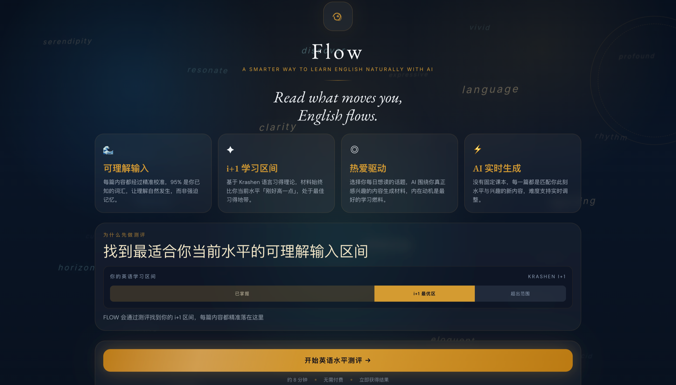 我正在开发一款AI英语学习应用Flow.AI,产品的核心理念是:真正的语言习得不来自死记硬背单词语法规则,而是大量吸收「刚好比当前水平高一点点」的真实语言材料,即可理解输入理论(Comprehensible Input),并在兴趣驱动下持续沉浸其中。