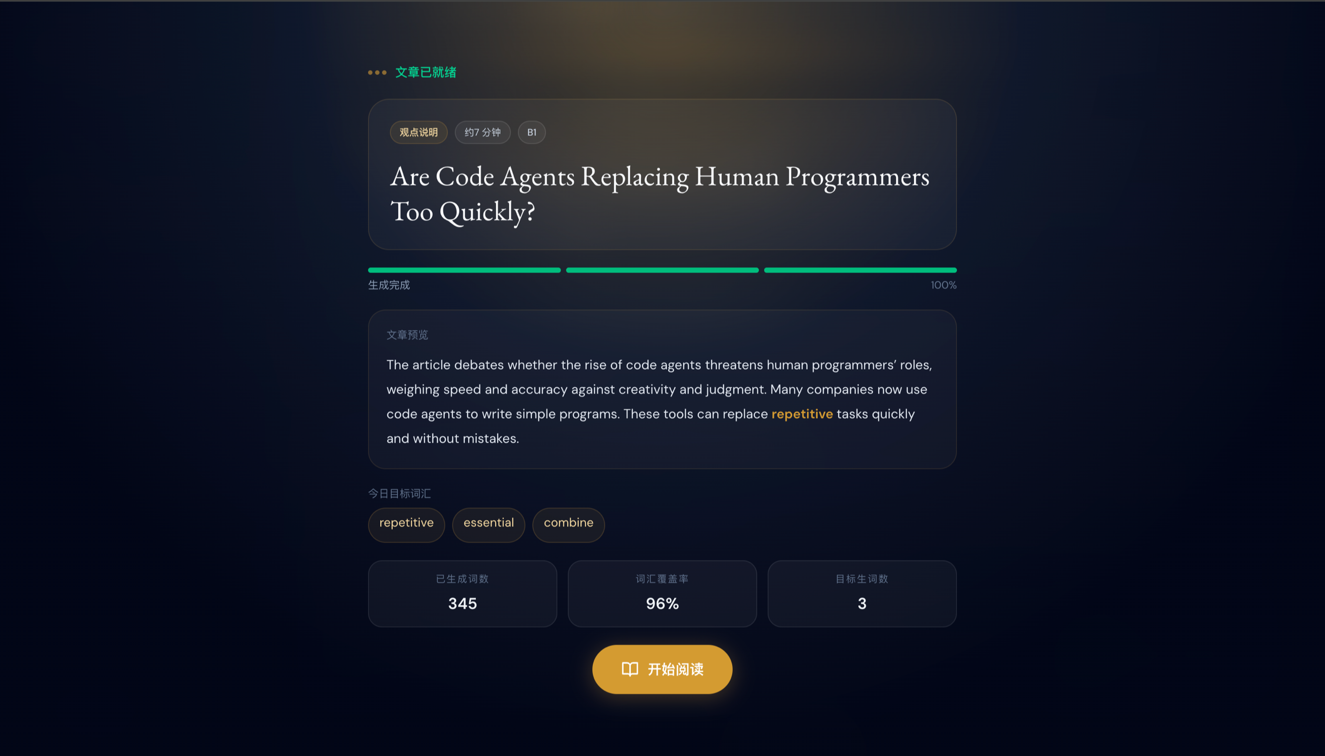 目前已经完成了产品MVP阶段的核心功能开发,正在完善前端UI的细节,微调AI个性化内容生产引擎和实时难度调整的算法,预计三月下旬会上线Web端的版本v1.0.0