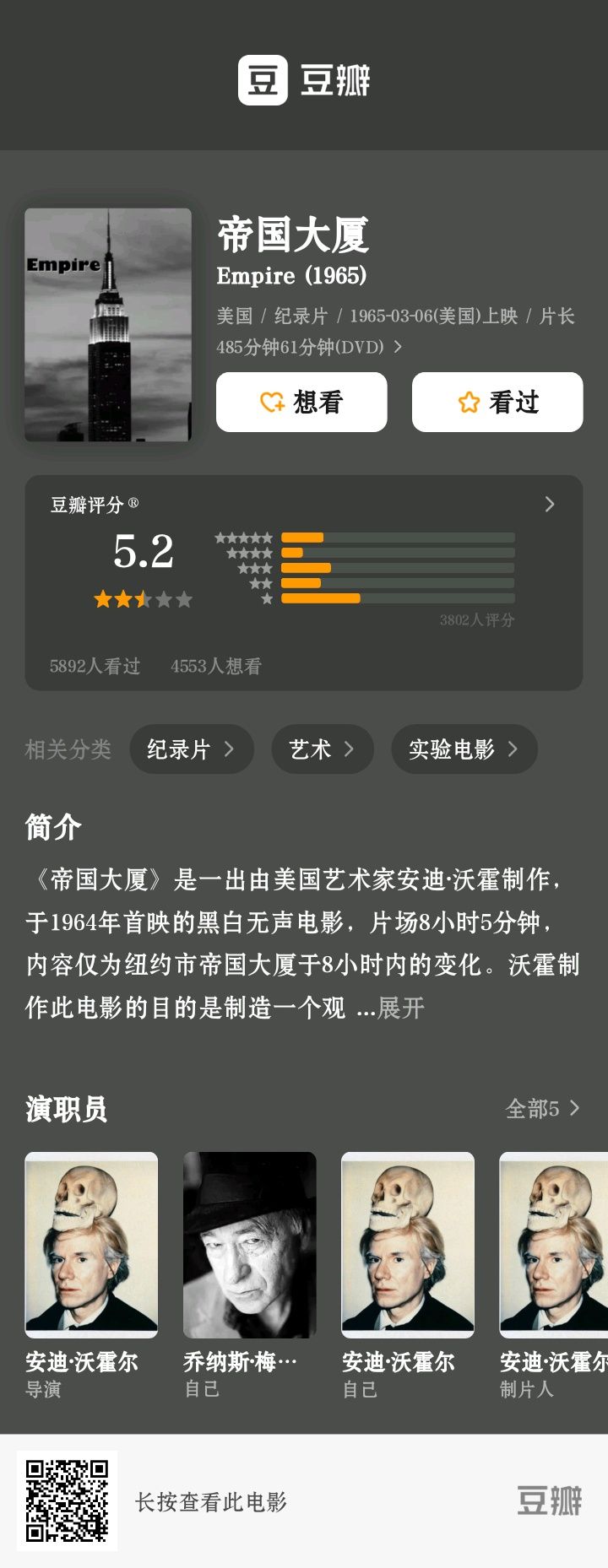 早上看一篇文章讲到实验电影和布拉哈格,然后去找了找他出演了不少乔纳斯·梅卡斯的作品。接着看到了《帝国大厦》,好奇这电影拍八个小时怎么换的胶片,于是去翻翻有没有人问这问题,然后就看到自己两年前已经问过了……