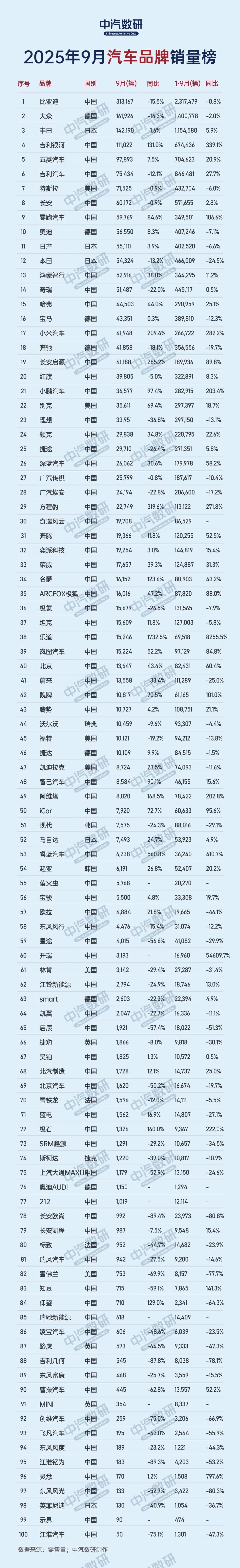9月汽车零售品牌榜