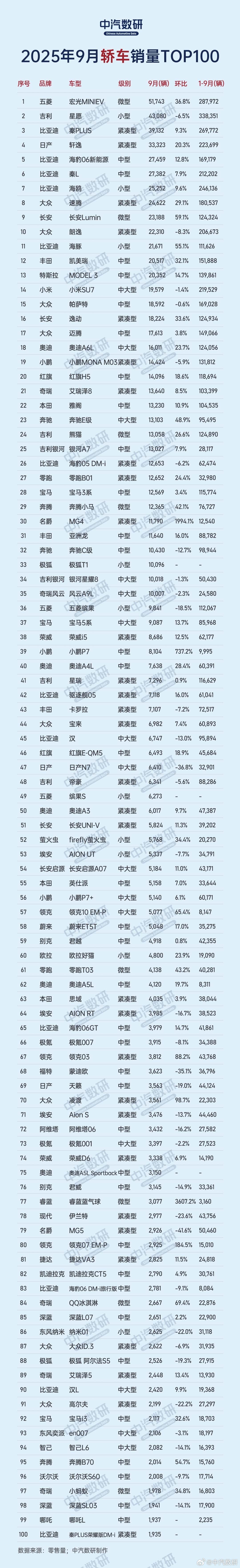 最新出炉的9月车型销量排名!