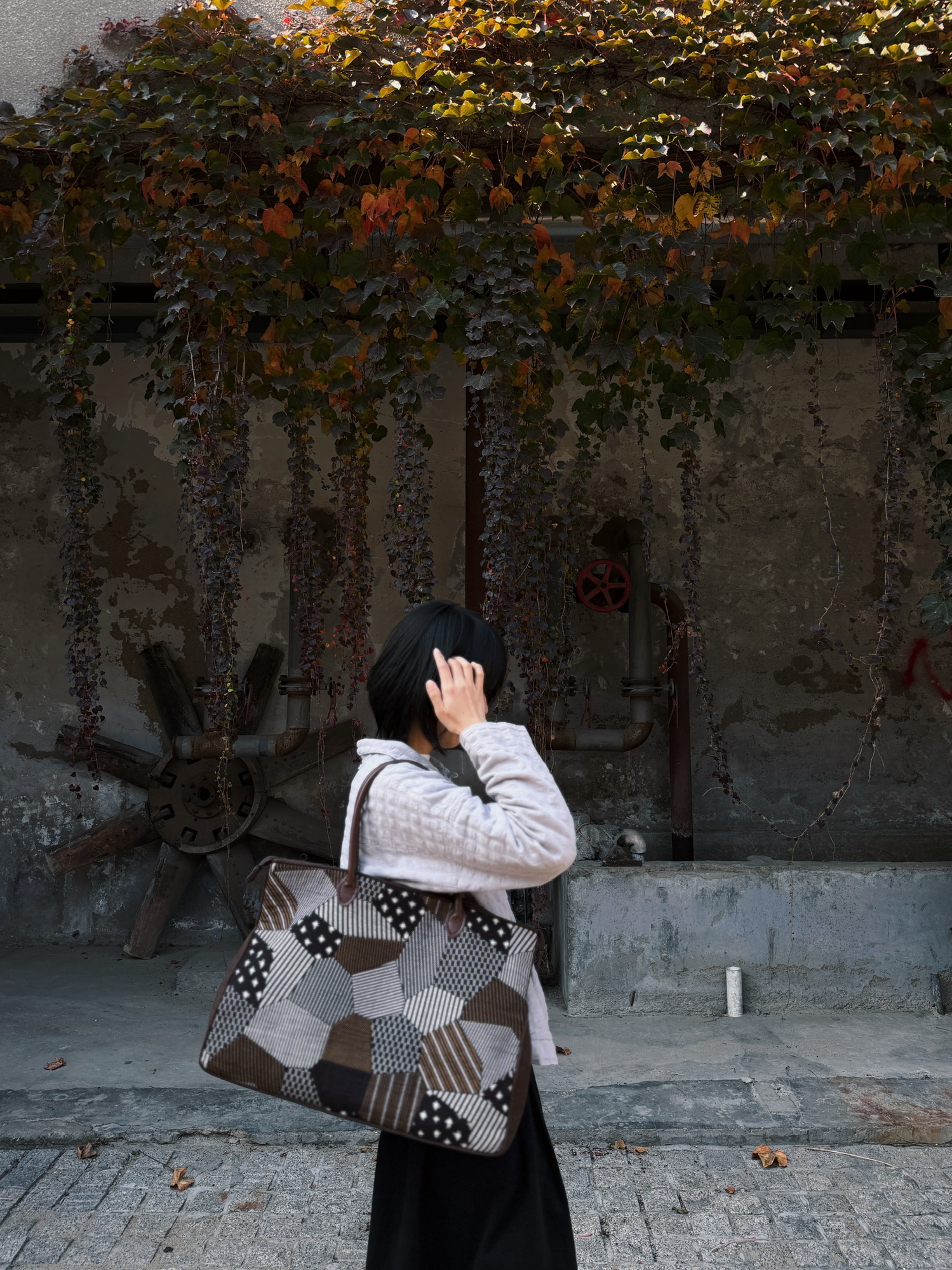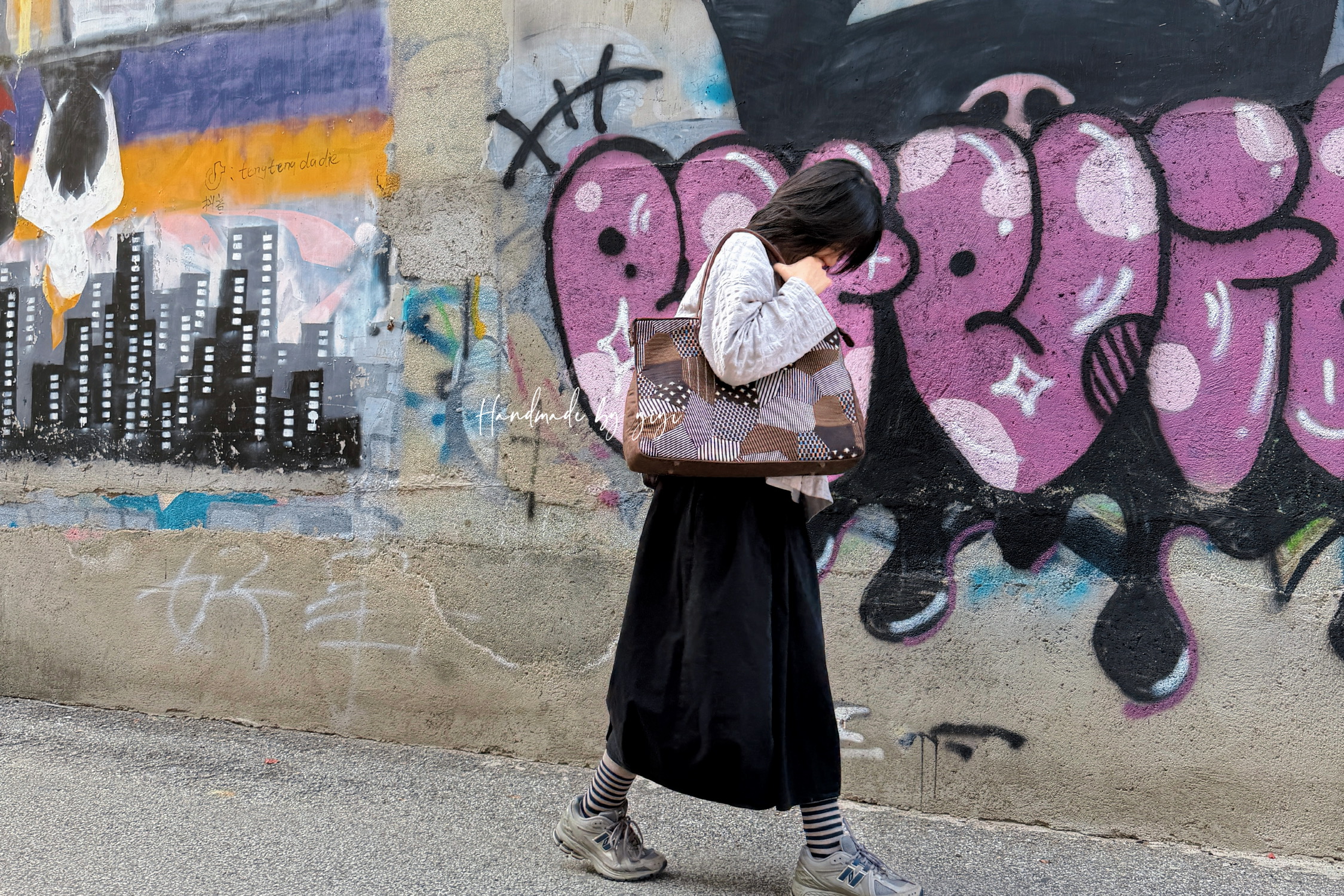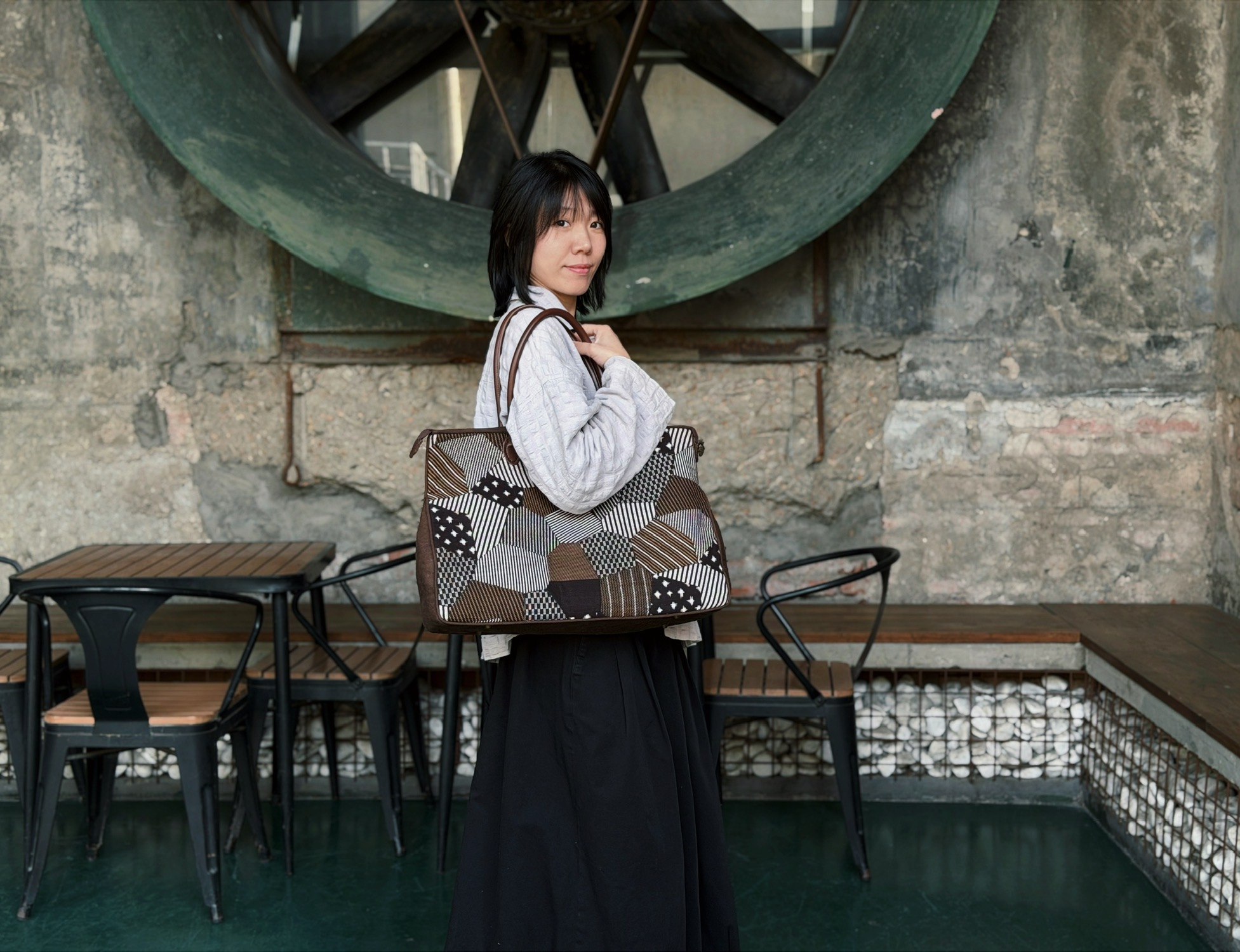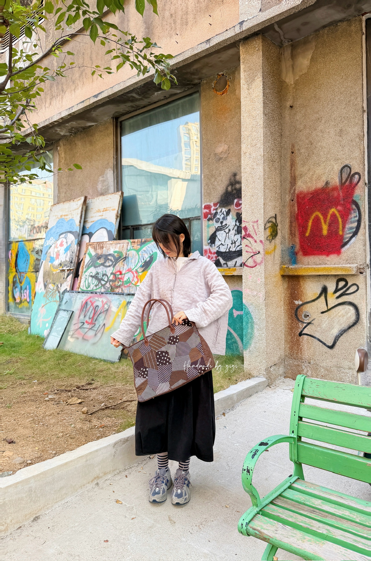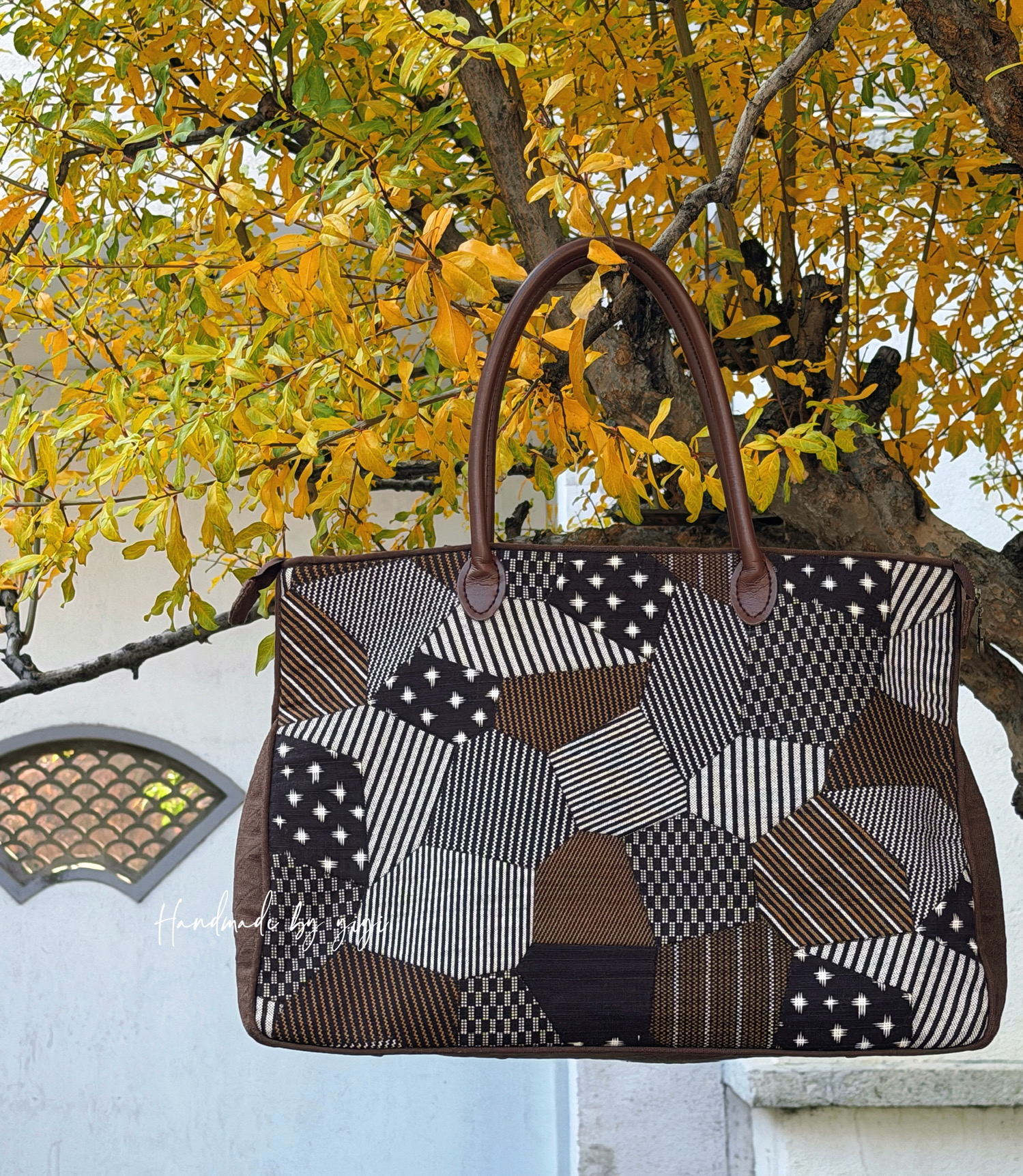 复古碎花布片拼出的扇形,配上黑色包身~