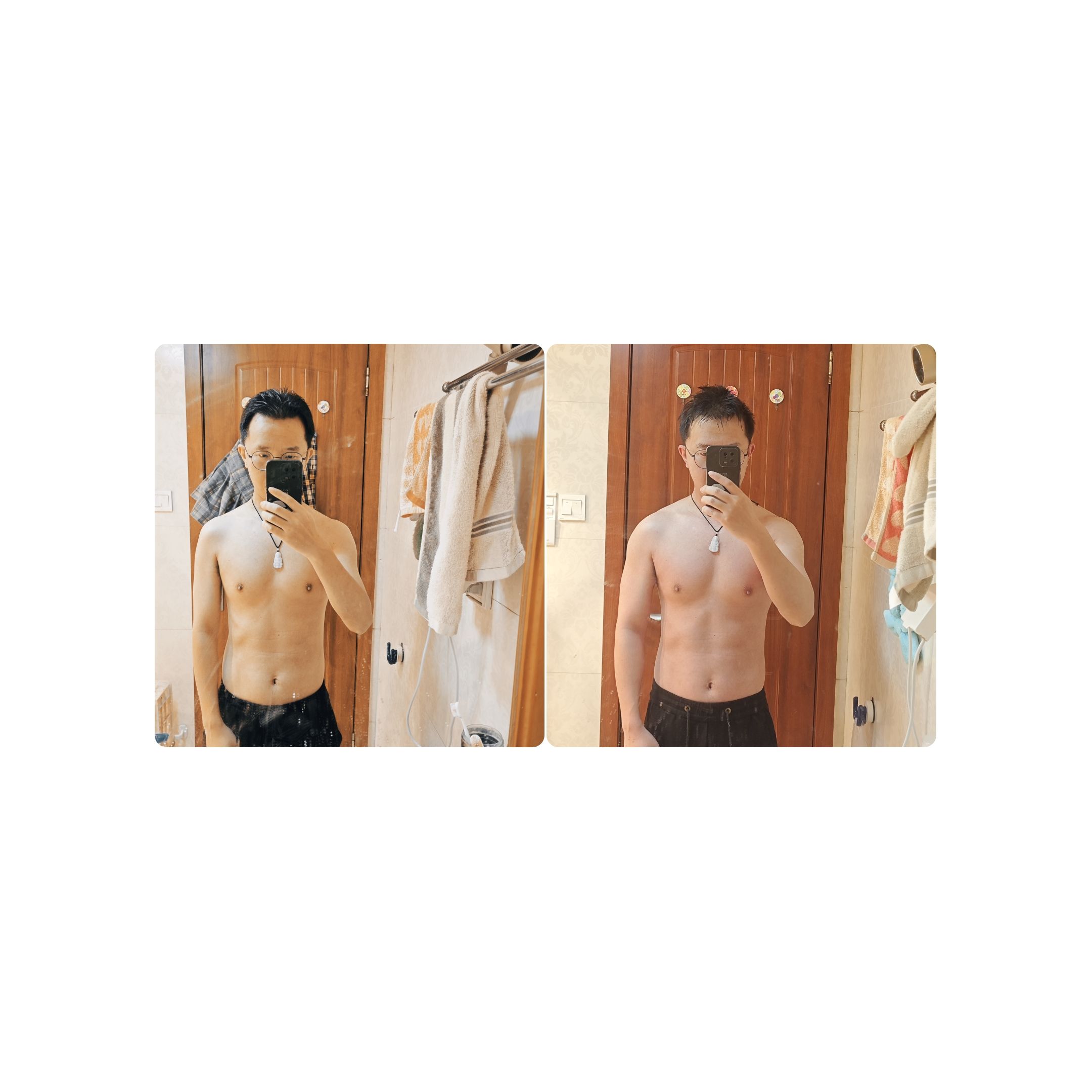 我来秀对比了,体重增加7公斤,体脂没什么变化,所有裤子不用系皮带,洗衣服的手更带劲了,阶段目标完成。
