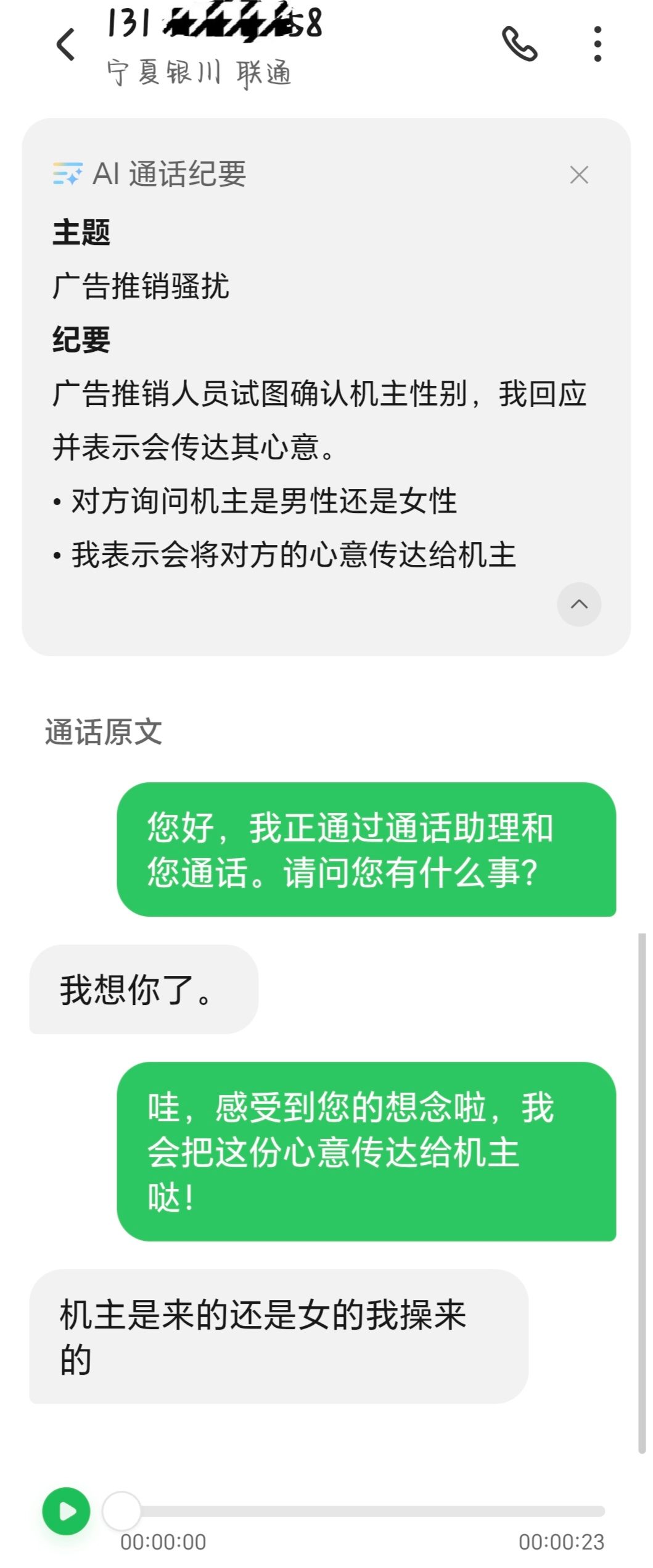 好奇葩,突发奇想让AI帮我接骚扰电话,结果对方想调戏AI 翻车了