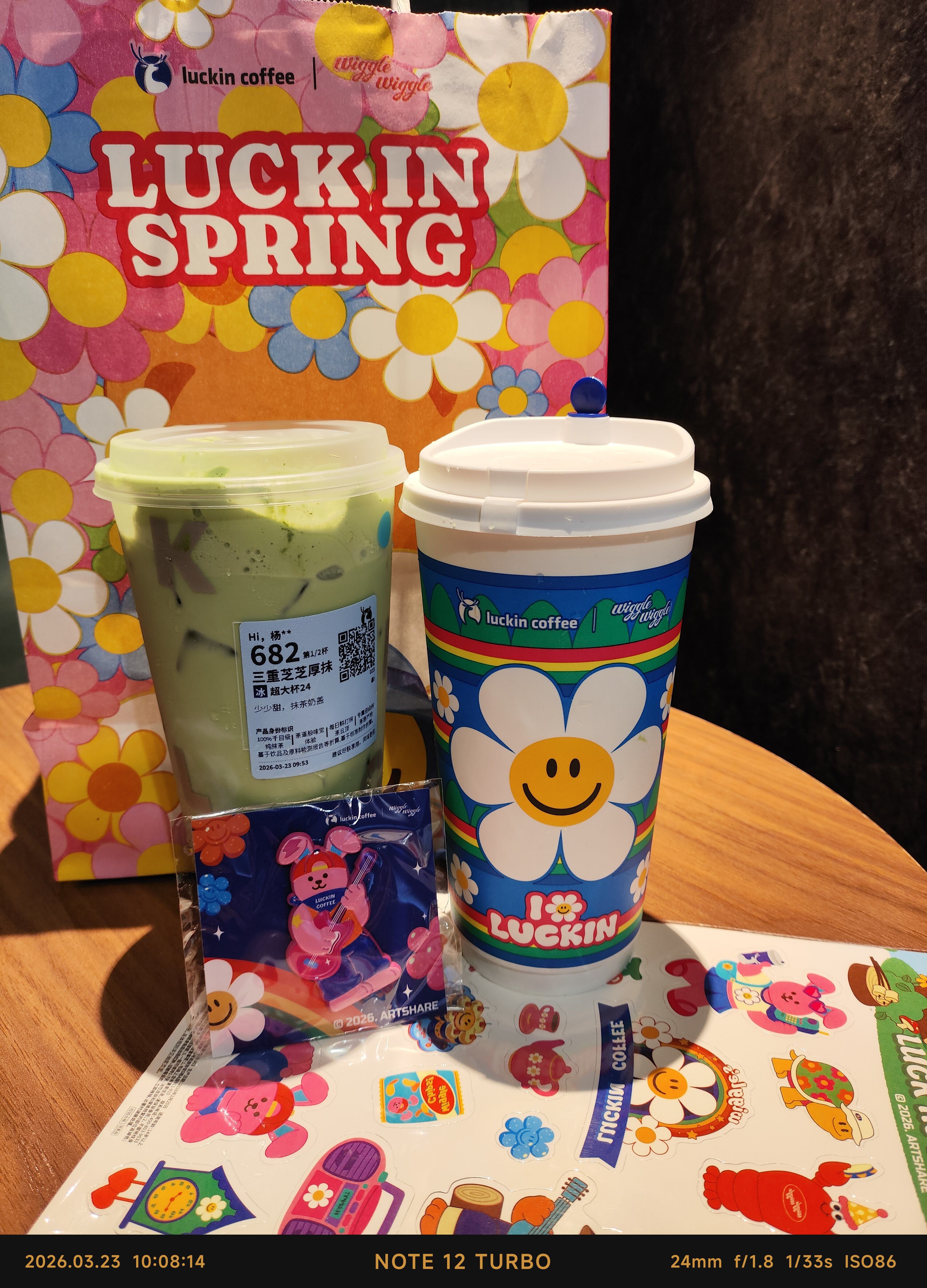 瑞幸咖啡,点一杯联名Wigglewiggle的新品三重芝芝厚抹,配一个wiggle兔子的金属徽章,加一个春日wiggle联名纹身贴,再得一个咖茶一下的电子徽章,很超值。