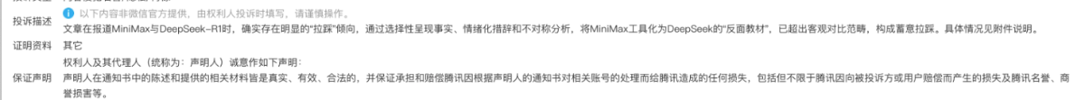 没想到这篇仅140+阅读的技术分享周刊,竟然能遭到minimax的投诉,投诉的理由是:说我刻意工具化ta,捧deepseek是一种刻意拉踩行为,侵犯了minimax的名誉权....