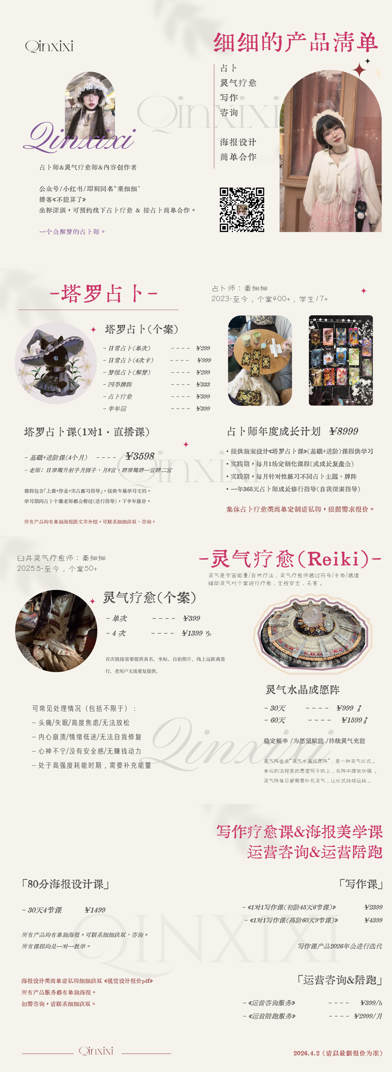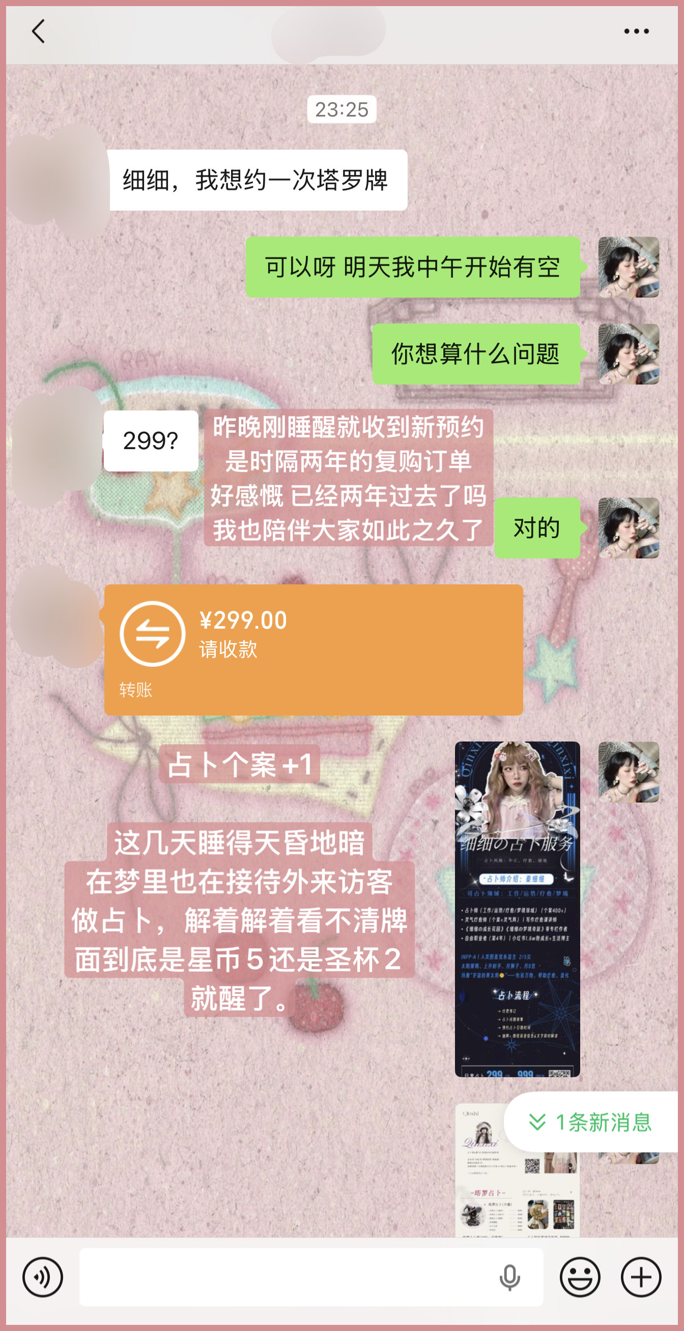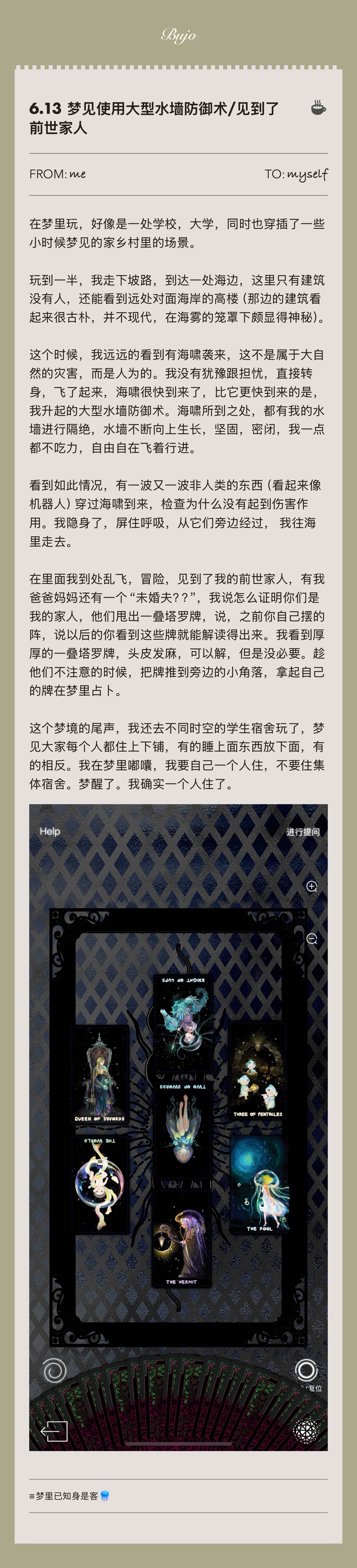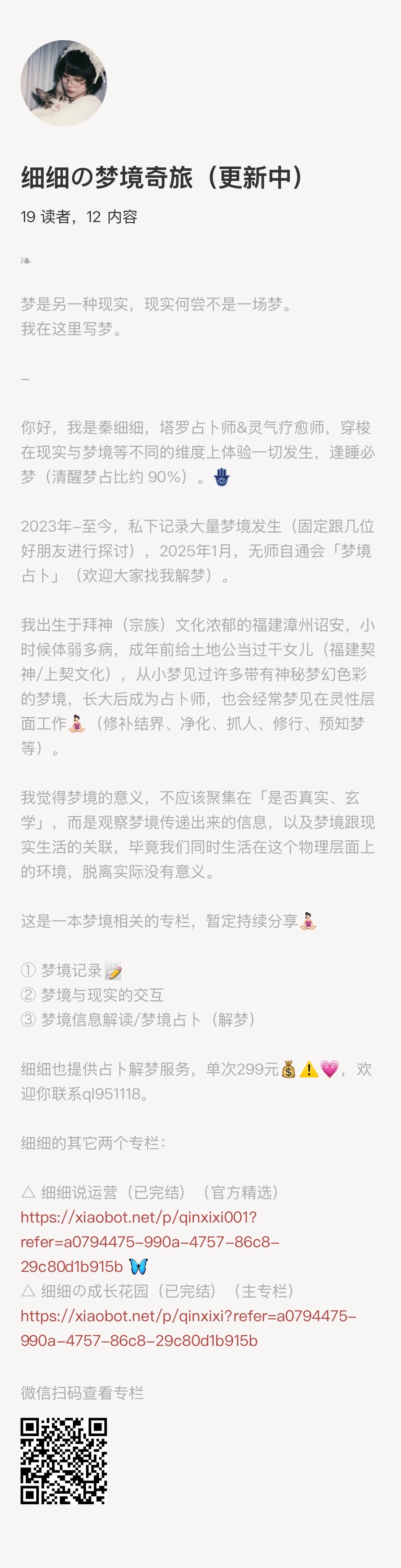 《细细の梦境奇旅》专栏、塔罗占卜解梦服务(跟日常占卜价格一样)、 塔罗占卜课进阶课有一节梦境占卜的(可单独预约,但是课件我还没有做,有人约我就做hhh没人我就先偷懒👩🏻)。