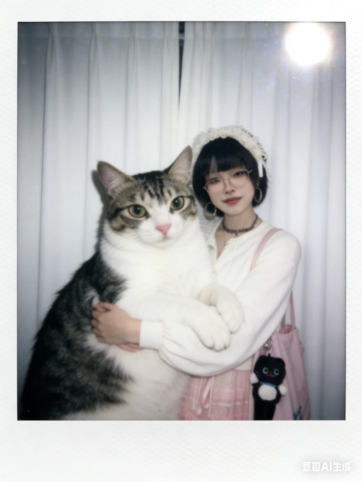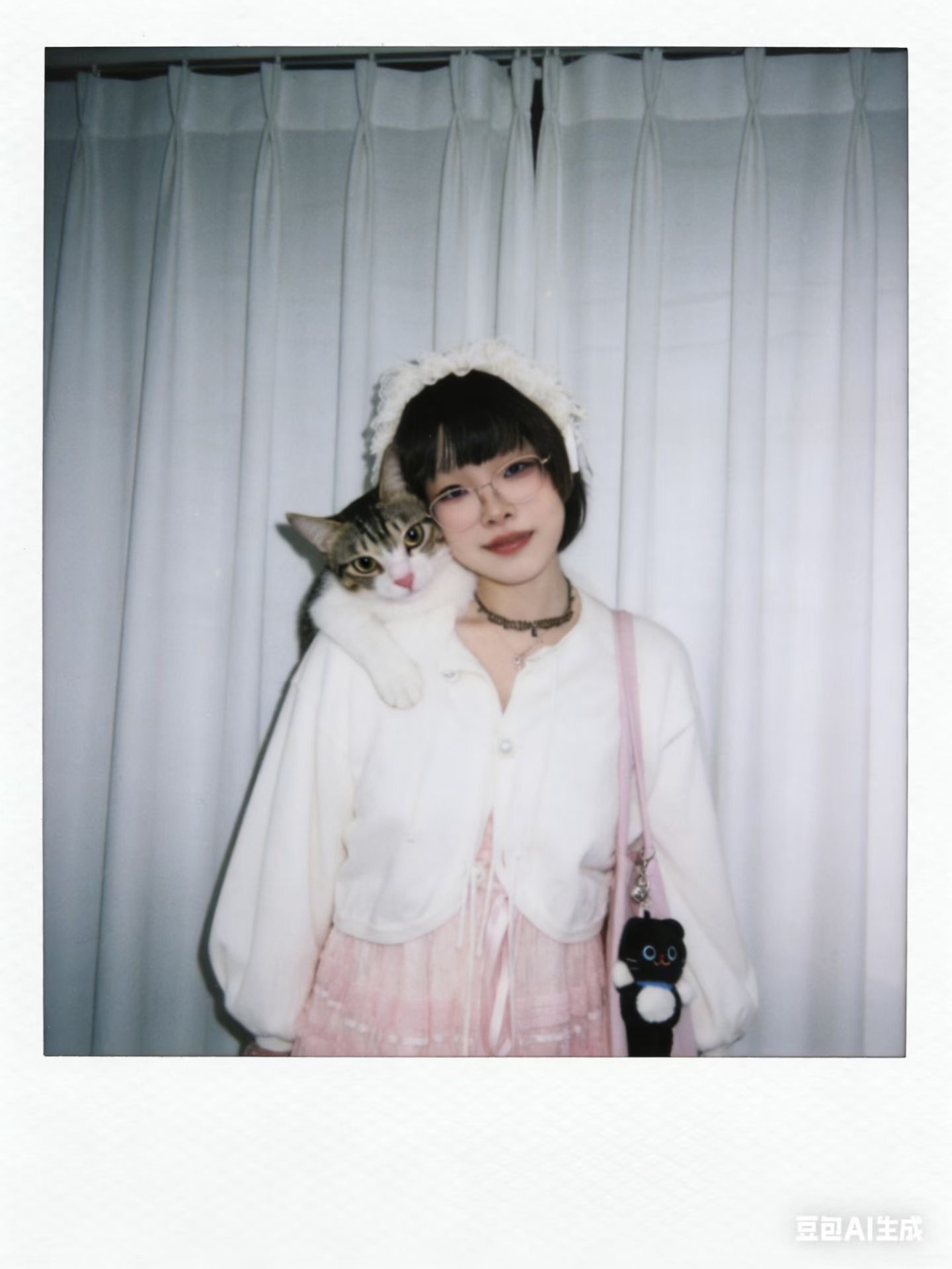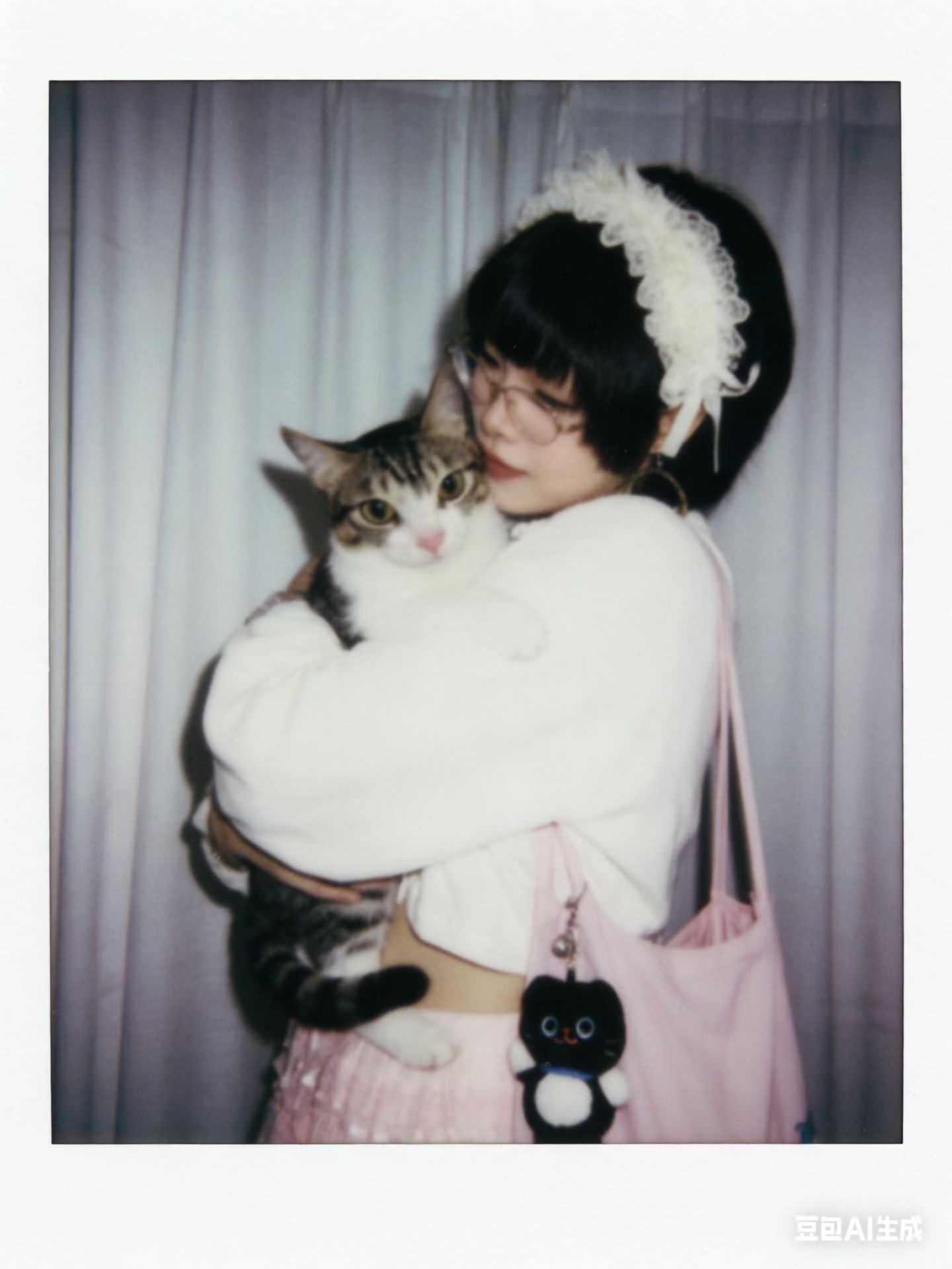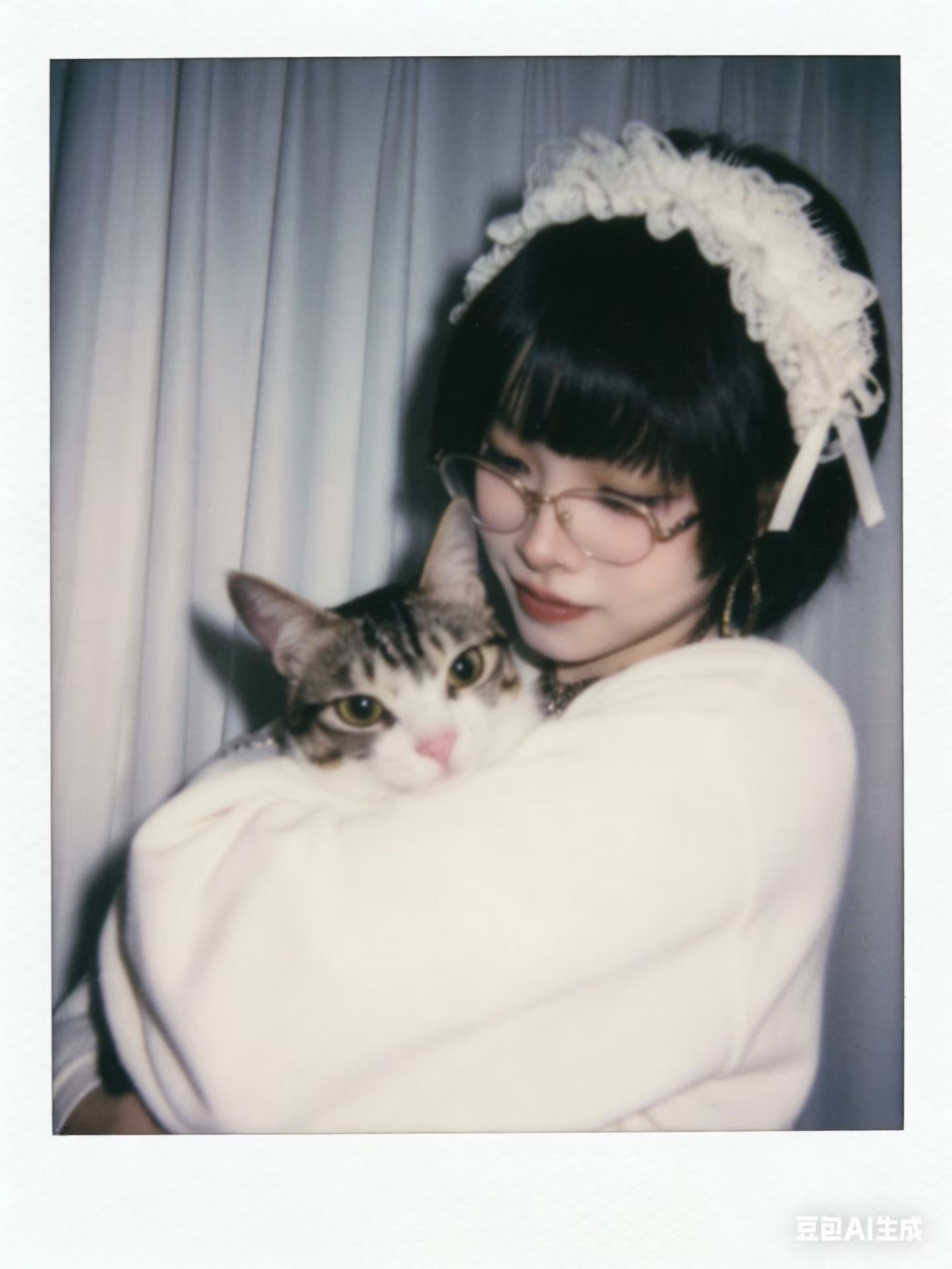 3.风格与画质:整体呈现宝丽来相机拍摄效果,画面需有轻微模糊感,无明显清晰焦点;光线为暗室闪光灯效果,光源均匀散射在整个画面中,亮度一致且柔和,画面整体清晰度不要过度锐化脸部。