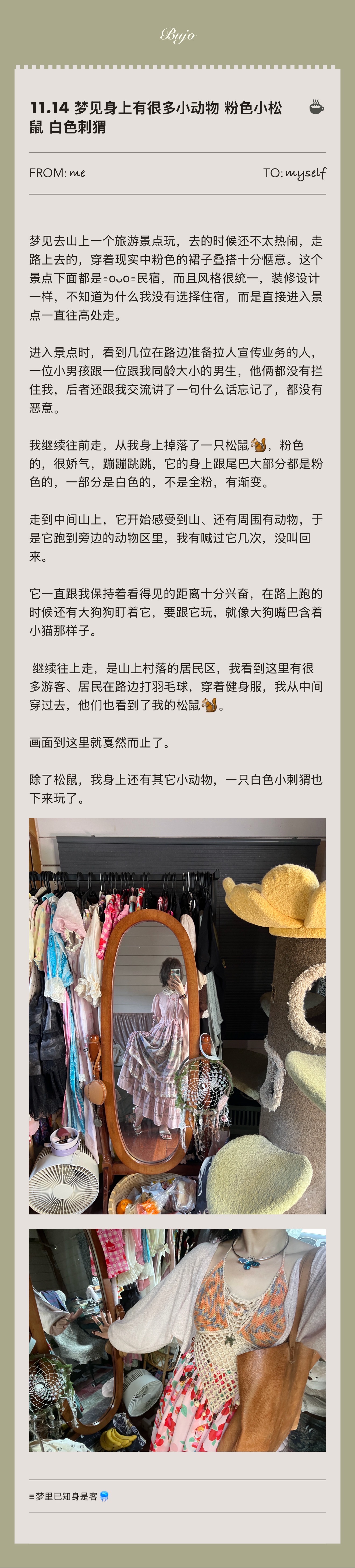 图⒋ 2025.11.14 梦见接入集体潜意识,独自往山上行走,身上陆续掉落粉色小松鼠、白色刺猬🦔
