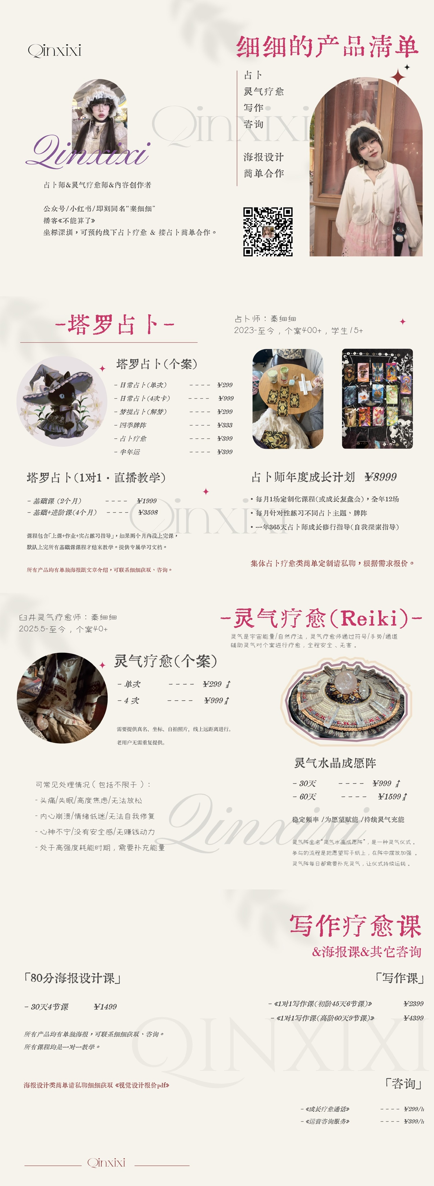 「占卜疗愈」跟「日常占卜」的区别是,后者就是一次一个问题,前者除了会包含倾听+抽多组牌以外 ,还会固定地帮个案本人做一次身心灵能量状态占卜。