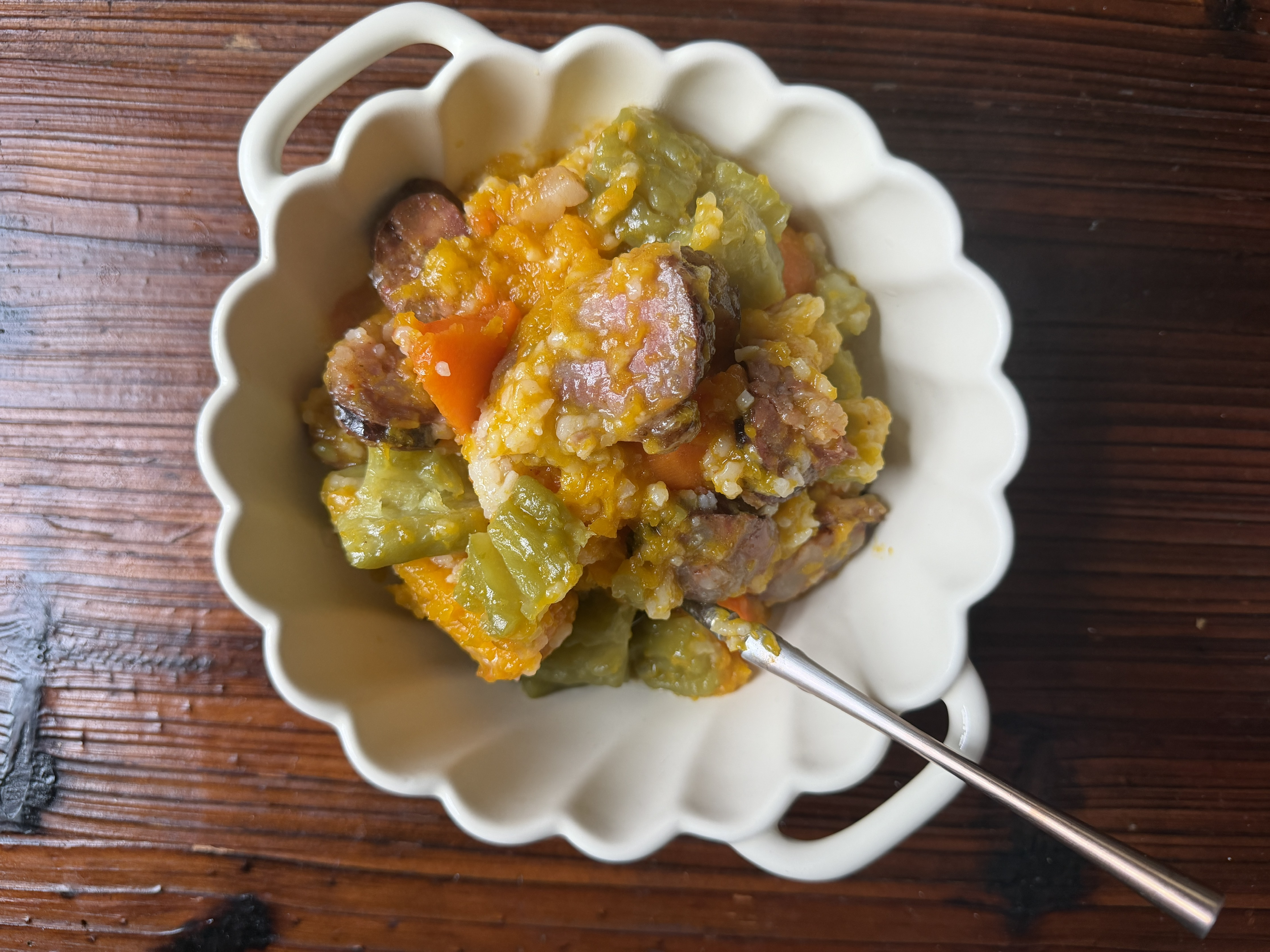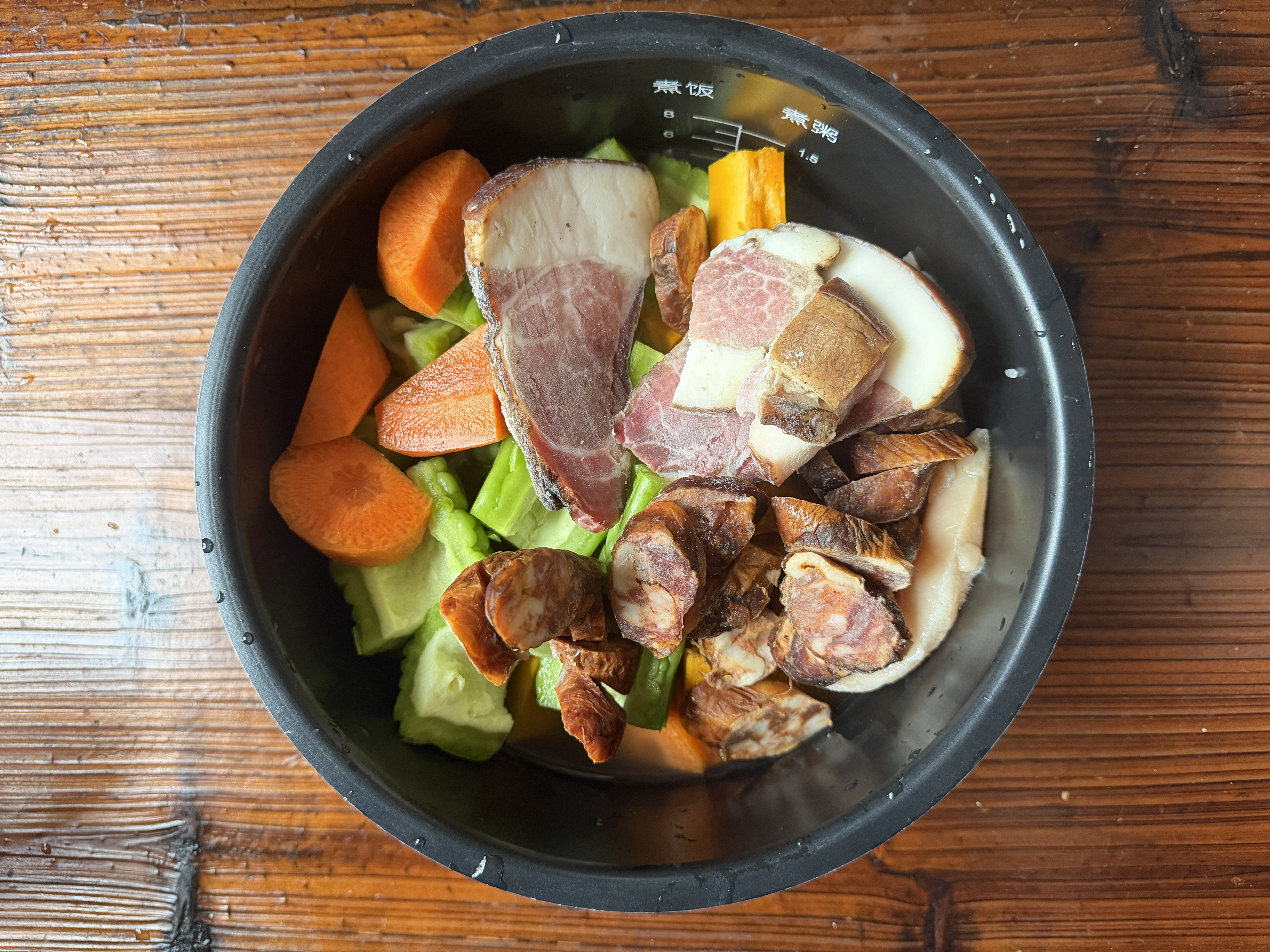 顺便做了一大锅电饭煲焖饭,放了「胡萝卜🥕一根/南瓜🎃一个/鸡胸肉一盒/香肠一根/腊肉一大片/还有一根苦瓜,跟米饭,没有额外放任何调料」。