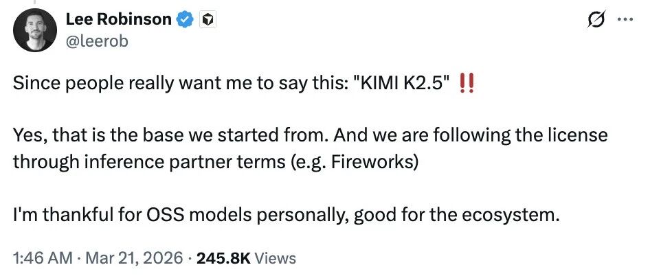 Cursor founder Aman Sanger 随后承认了基座是 Kimi K2.5,说博客没提是「a miss」,下次改