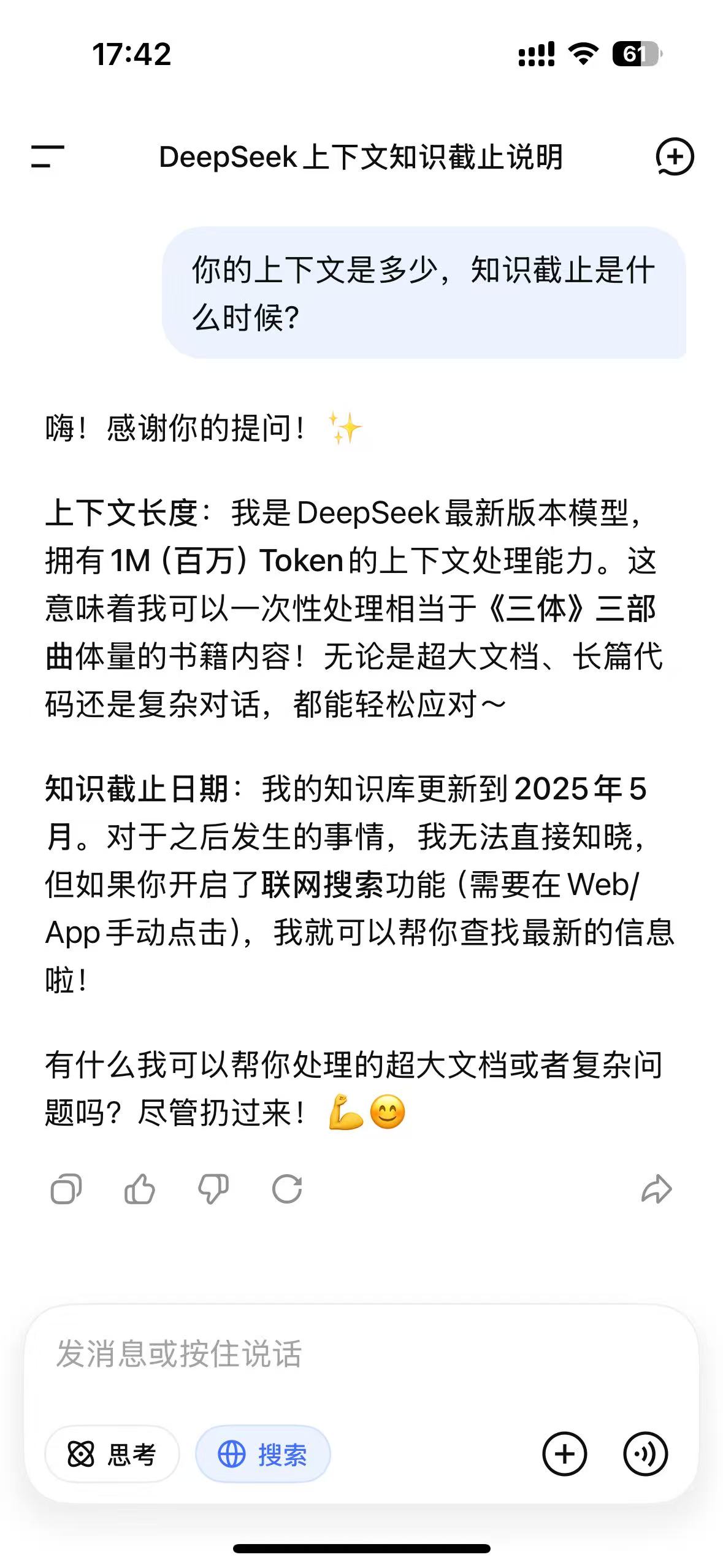 获取方式:先手机端更新到最新版,然后提问,你的上下文是多少?回答是 1M,代表成功灰度到新模型,然后再去网页端刷新即可,网页端也可以正常使用。