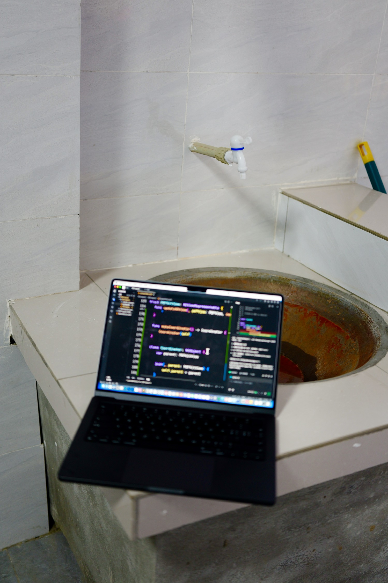 有人说这是“大地调色盘”,显然很成问题。这是人类活动的证据,并非自然形成之物。我去的这天很阴沉,航拍后加上调色相当好看,但实际上在观景台用肉眼看尾矿湖的话,会感觉湖上飘着一层厚厚的像油膏一样泛白的物质,怎么形容呢,就像是一锅炖肉放凉了之后表面上漂浮着一层又厚又粘稠的油脂,很倒胃口,不敢想象谁要是不小心掉进这湖里会怎么样。如果恐怖小说中的古神克苏鲁苏醒,我想大概就是在这样一种又厚又粘又妖异的物质中缓缓升出水面的吧。