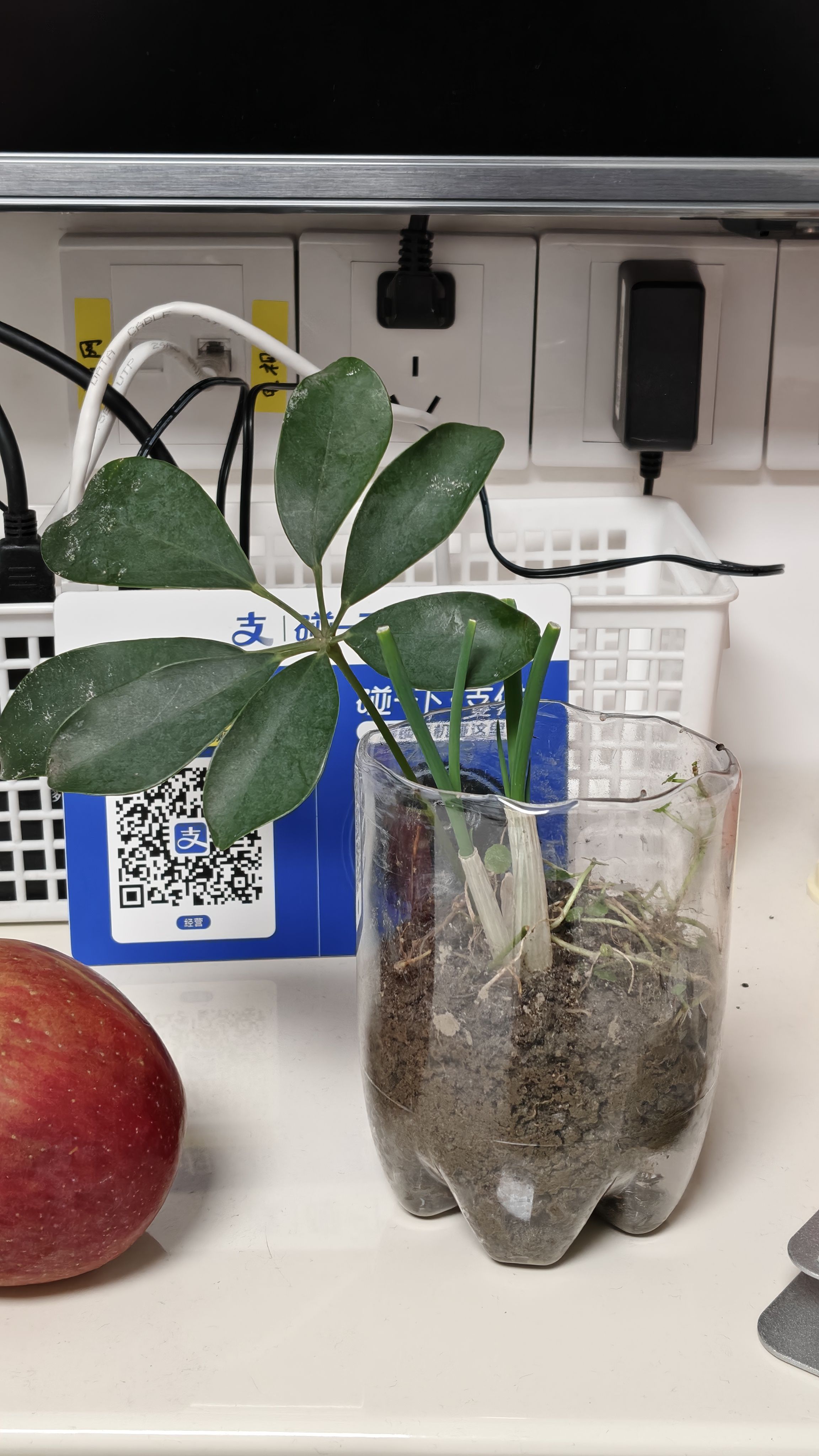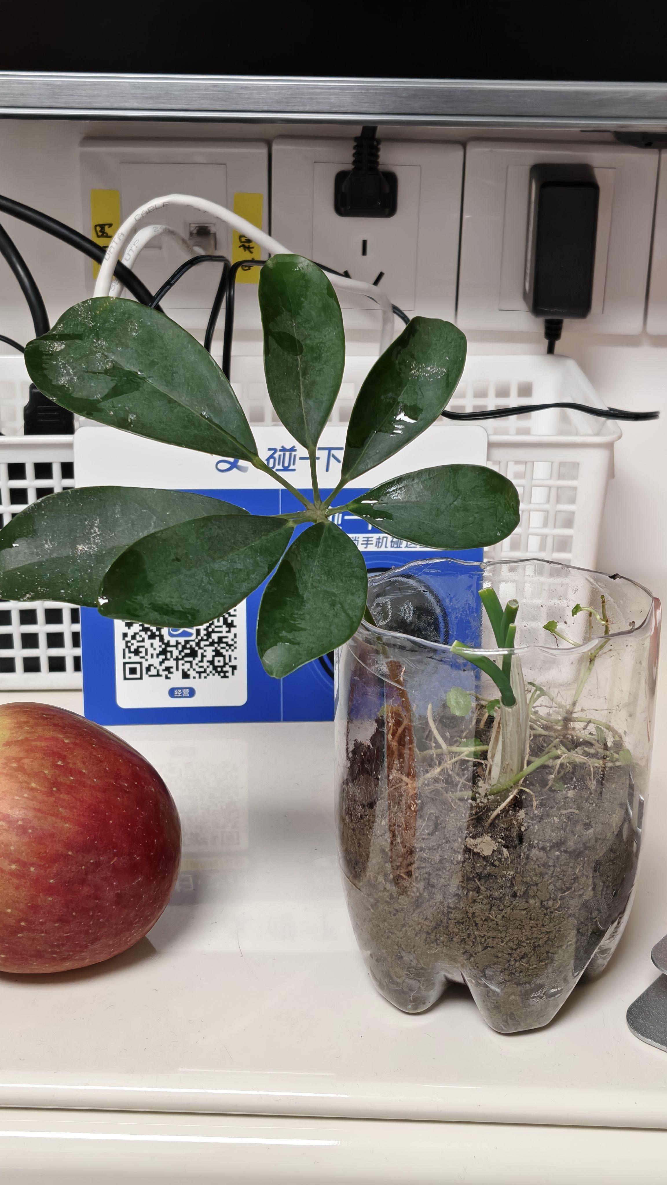 现在,一到岁数,一晃眼一周、一月、一年就过去了,会突然发现植物生长也很快。做饭剩下的葱头,前天插上,今天就冒出瓶了。下楼挖土的时候顺便薅了一根鸭脚木上来,看着状态也不错