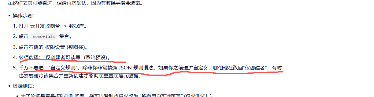 然后怀疑是代码问题,和cursor掰头半天,又转头问千问,发现云开发openid是自带的,代码里压根没写,整个一头包。最后在和千问多次对话里看到了图片这句话,千万不要选自定义规则巴拉巴拉,然后我就把权限改成了 仅创建者可读写,然后就跑通了。
