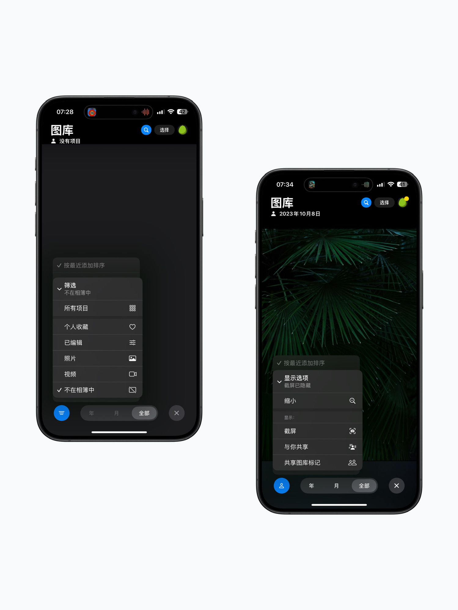 4. 在筛选选项中选择“不在相簿中”,所有还没被分类的照片就会单独显示出来,再也不用在一堆照片里翻找漏网之鱼了。