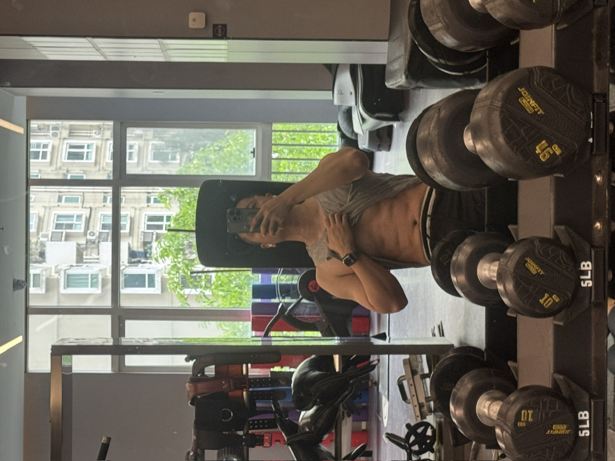 和旁边一样爬坡的女生同时停下,满头大汗,相视一笑,有氧真累啊