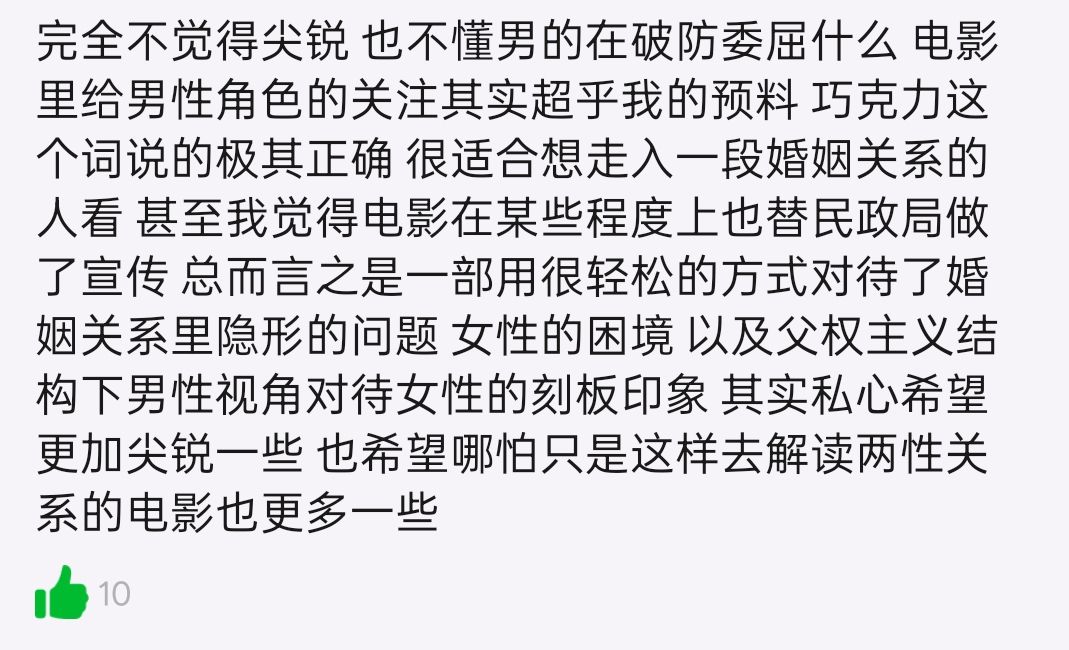 如果说它是会影响结婚率的女权电影而去攻击举报就太敏感了,最多算是一部赚女性票房的感情喜剧片,电影里出现的长辈只有女方父母,唯一与婚姻生活沾边的只有开头几分钟的家务占比,这才哪到哪儿,会影响结婚率的从不仅仅只有感情。
