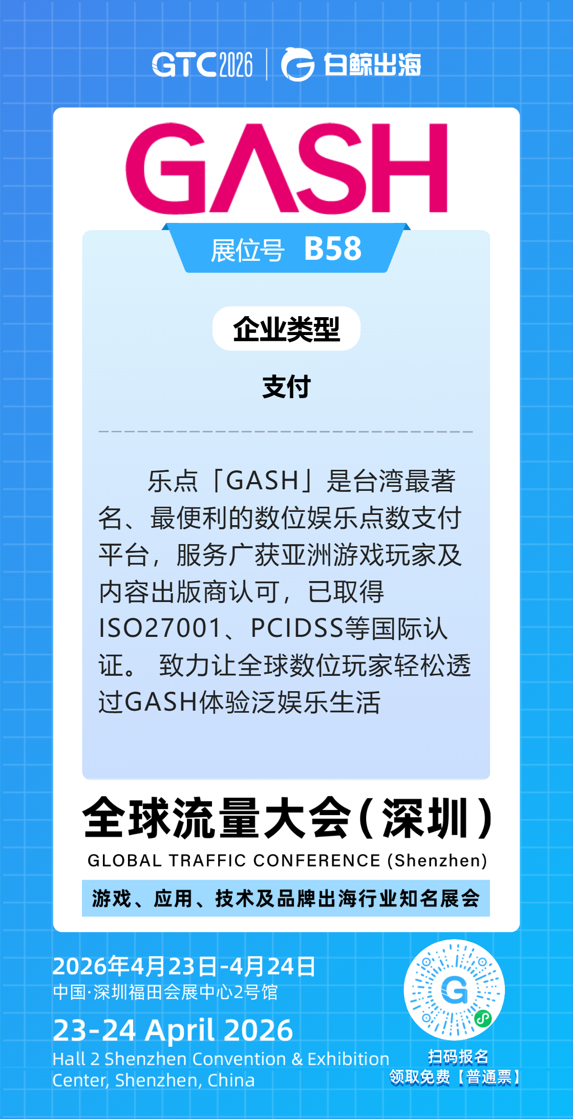04月23日~04月24日,欢迎中国移动出海前辈&同行、拨冗莅临“白鲸出海” 深圳 GTC 2026「乐点 GASH POINT」展位(B58号)🎉资深出海金流精英同侪,为您呈报介绍台港澳及APAC最新移动娱乐市场动态及行业先机👍期待与您见面交流🤝