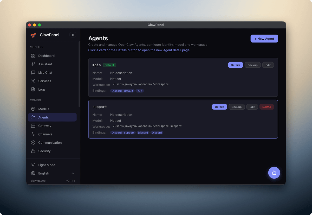 今天推荐的管理工具叫ClawPanel,开源免费,支持管理agents、channels、skills、jobs等,常用设置都gui操作,自动写到openclaw.json文件。工具支持备份配置文件,出了问题也方便查看日志和恢复