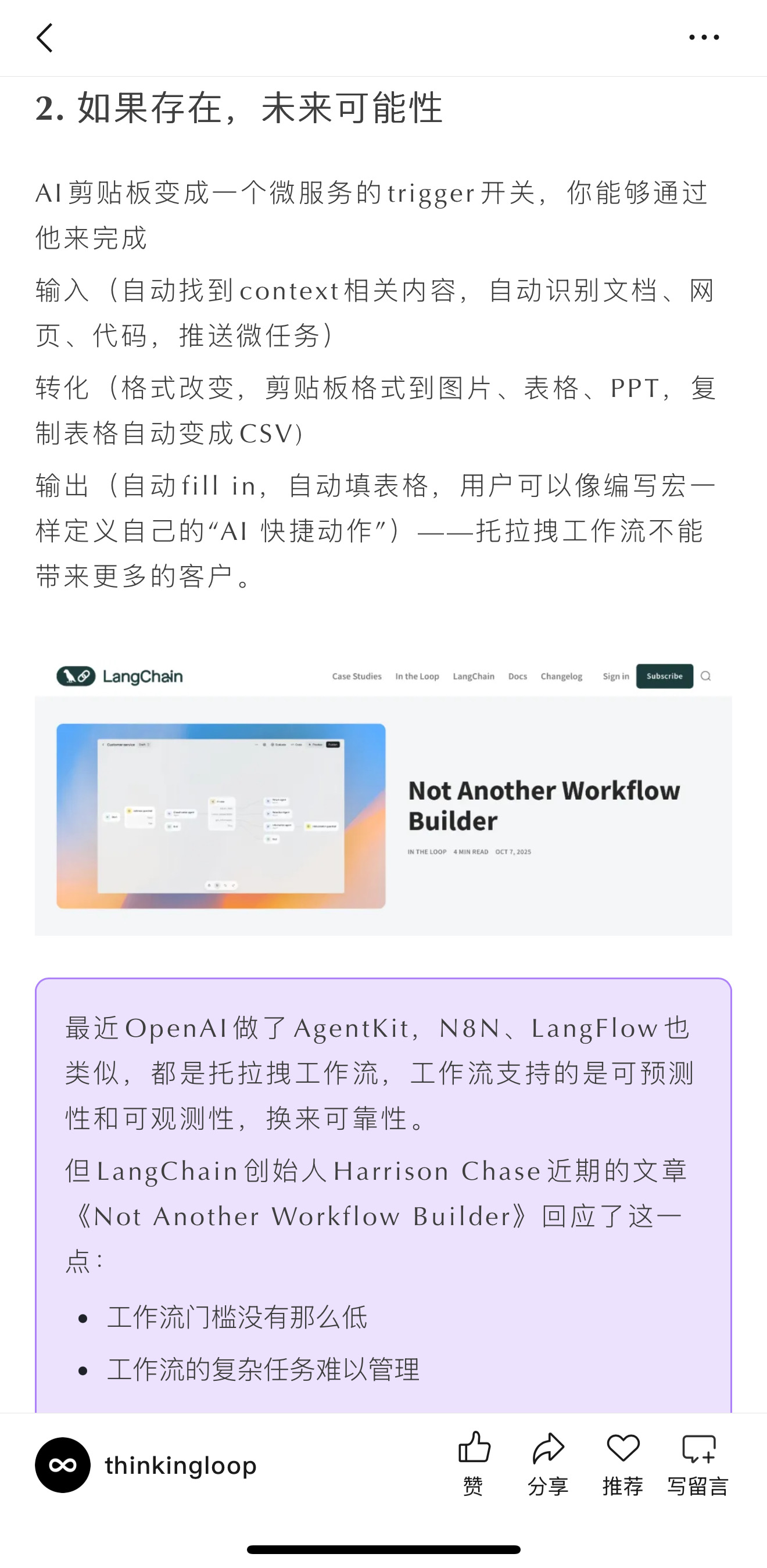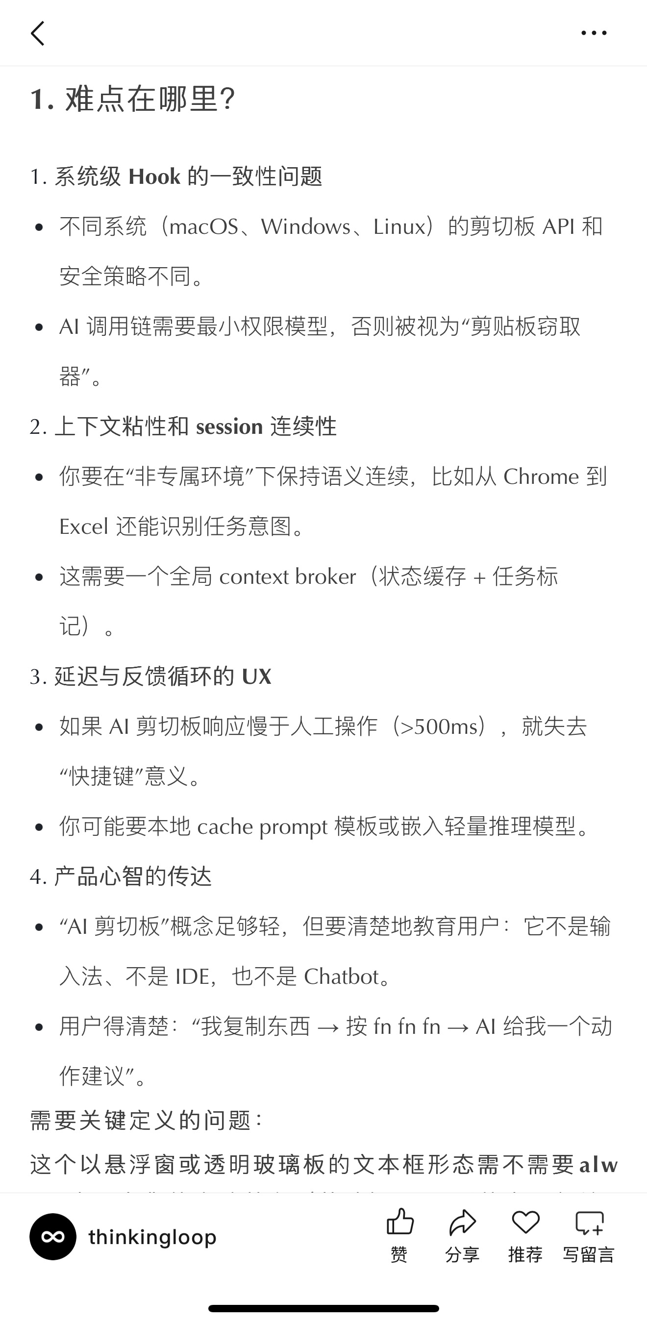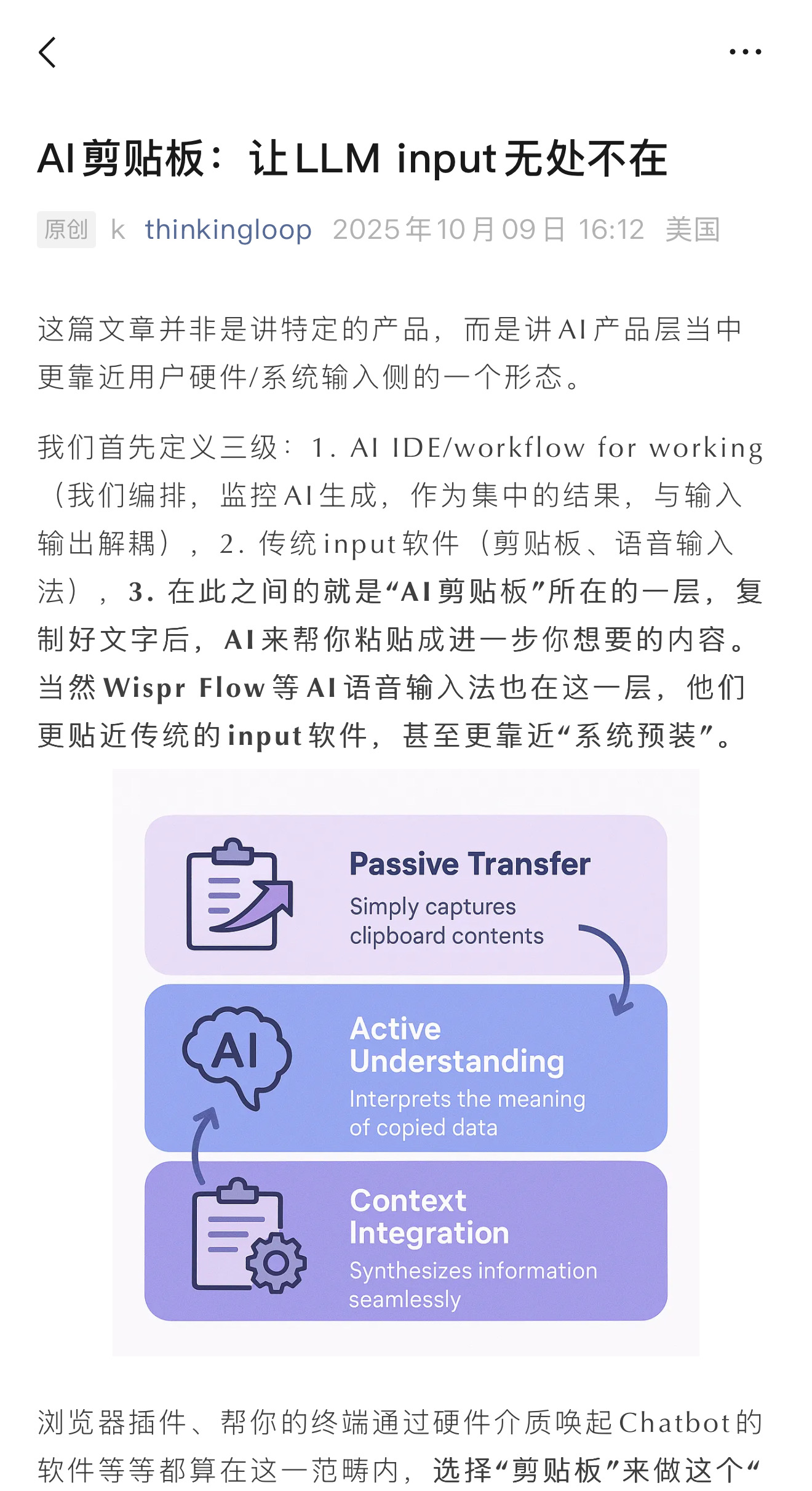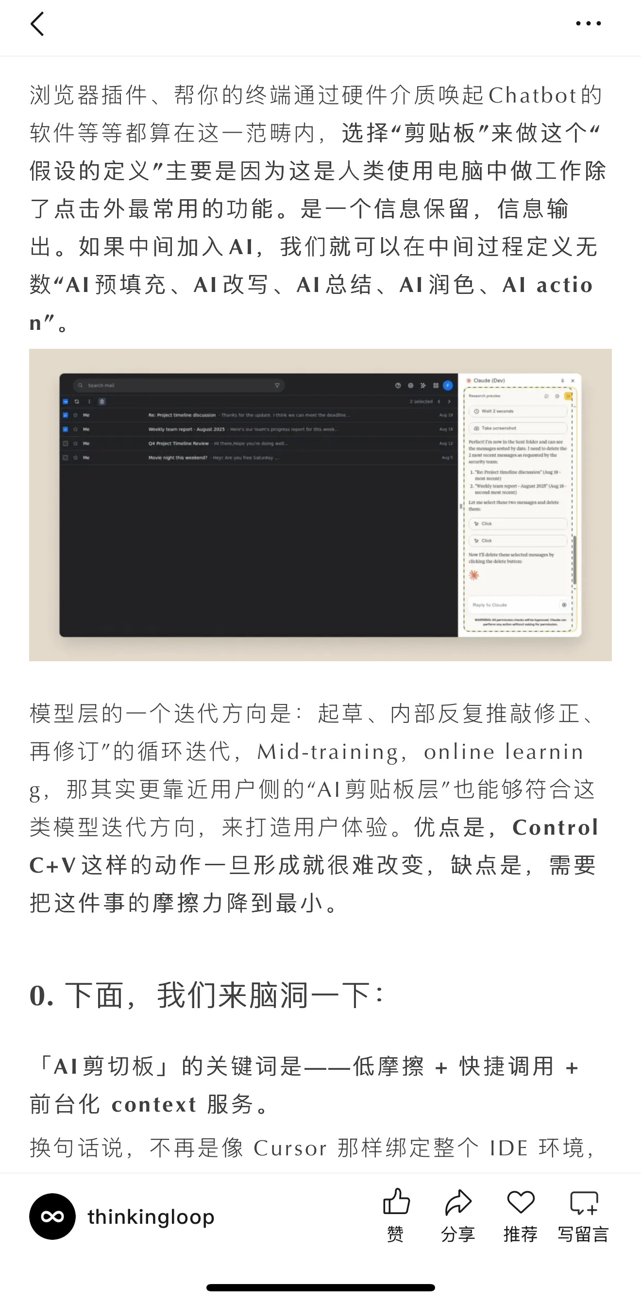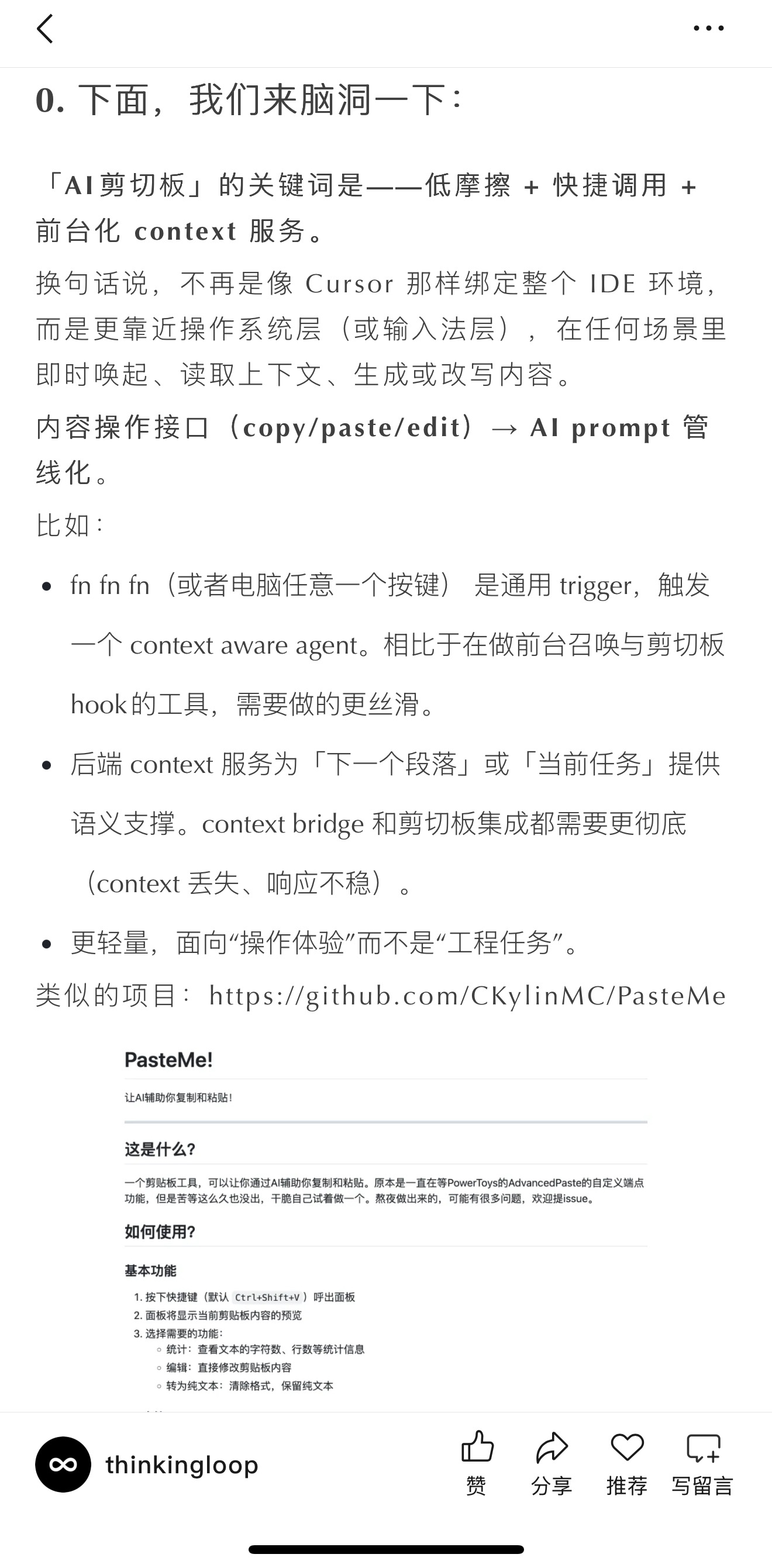 之所以拿出来讲是因为介于传统工作流与目前的N8N之间。这个产品形态让用户有一些可观测性,AI侧又是未来AI能力进步可以触达的。同时,接触用户交互端的所有创新都让我们遐想下一个AI General Assistant。我们通过Voice和剪贴板输入,输出信息(剪贴板内容)和Action(GUI\Computer Use模型)。似乎在离我们越来越近