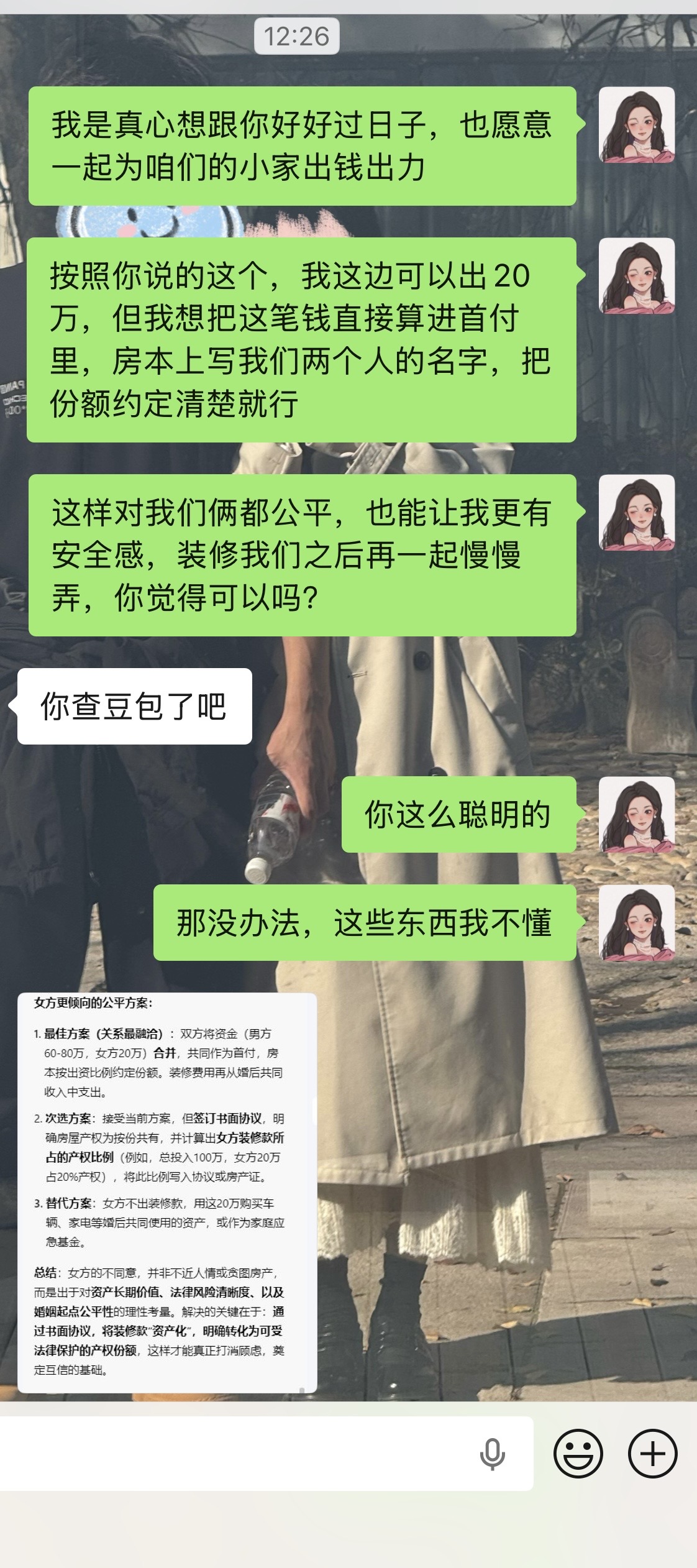 今天和男朋友聊到买房的事,不太懂,去问了下豆包,还让豆包写了点话术,笑薯,结果一下就被发现了🤣