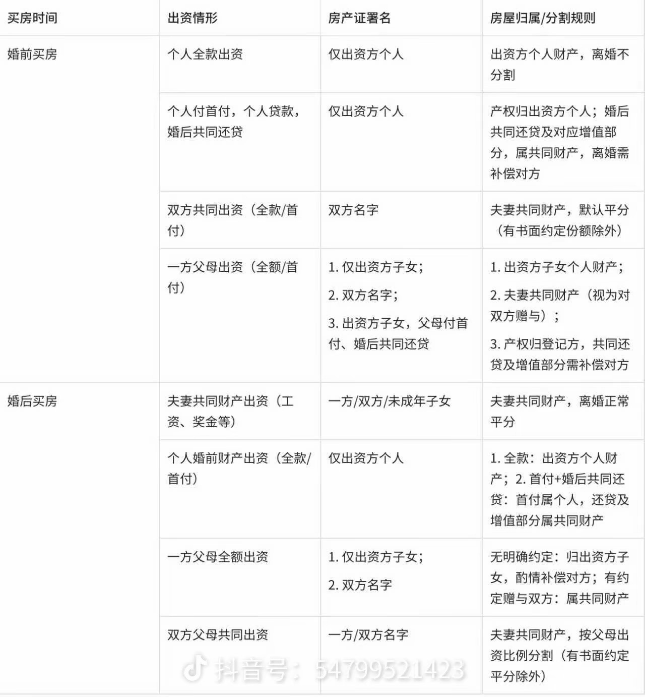 附上之前抖音刷到的买房相关的出资署名及归属情况的总结图,感觉干货很多,有需要的即友可以存一下。