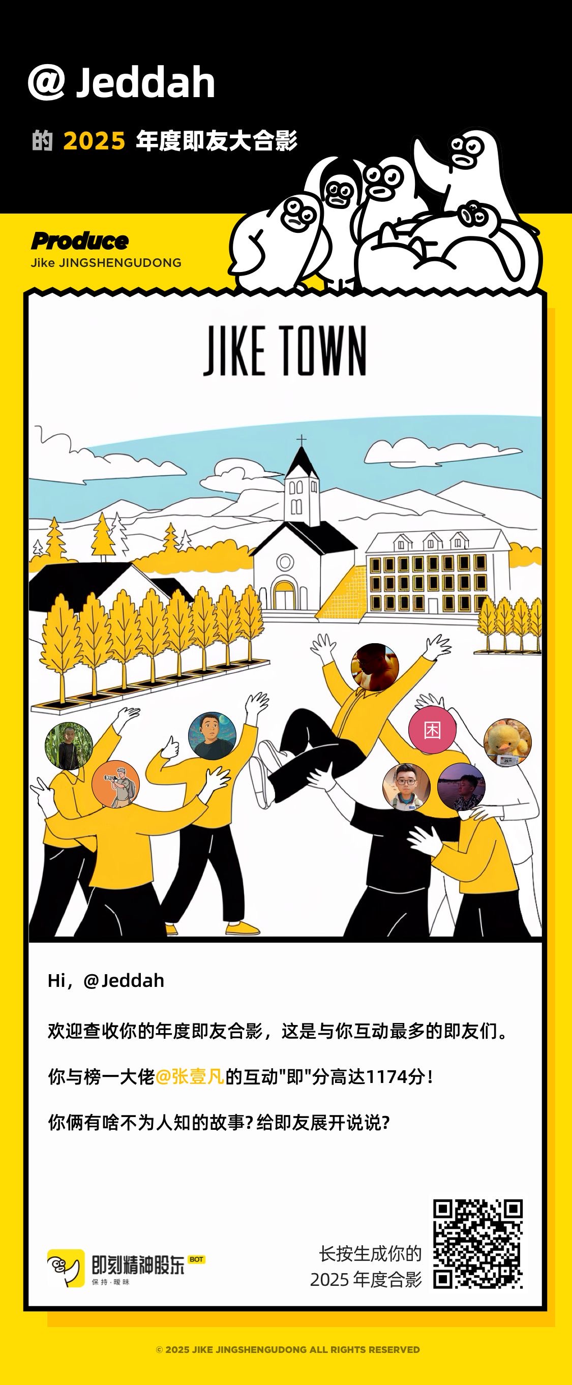 小花生太困了: 富哥小花生太困了你好,这是2025年和你互动“即”分最高的7位即友 1. Jeddah https://m.okjike.com/users/A214423C-0FD7-4470-92A9-C6A8D7F66E84 2. 大鱼霸 https://m.okjike.com/users/5C836F70-E1D8-49ED-BC04-8681239D45D5 3. 柗下淸亝 https://m.okjike.com/users/2D52567F-4C0A-4174-B3E5-B09403920FB6 4. 许炎 https://m.okjike.com/users/F5611F7D-B5D5-4C6D-845A-1D2DA0B55C04 5. a翔 https://m.okjike.com/users/FFAE794B-9FE3-404B-B1BF-9118E1602FF0 6. 迟到兔 https://m.okjike.com/users/2cc22d41-c991-400d-af40-d9d25fb5554a 7. 杠杠66 https://m.okjike.com/users/25175783-A9DE-4925-8F1E-694B83374707 快去发个动态,@这7个好即友告诉他们吧! 如果你喜欢我的活动,欢迎请我喝杯咖啡,让我继续为你当牛做马 🤣 ☕️ https://m.okjike.com/originalPosts/6763984dcc17b0c5d380a35a