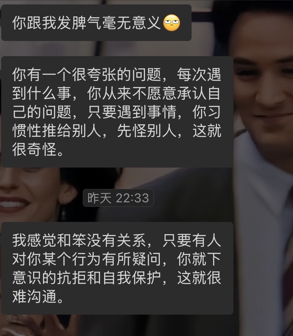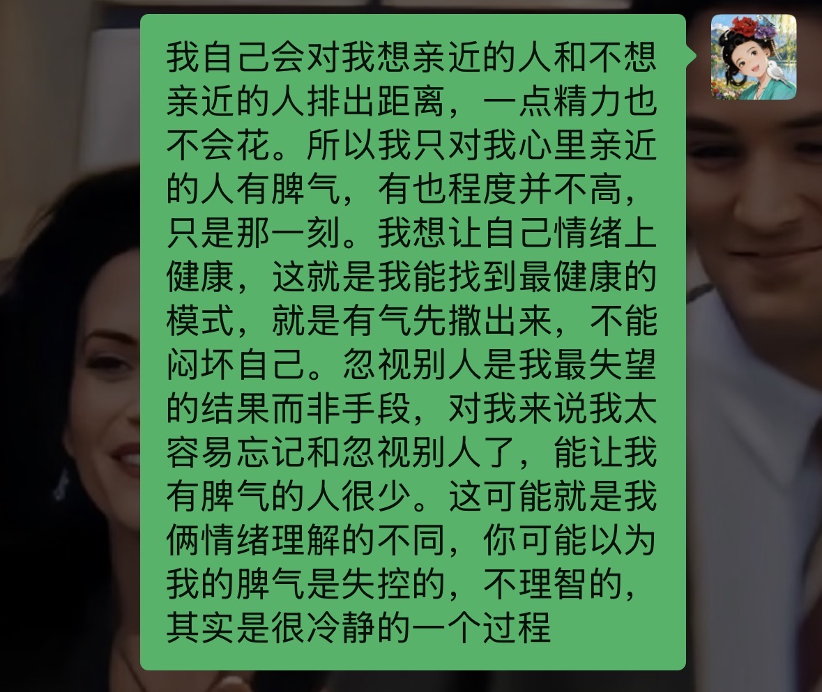 还蛮享受这样的对话的。我们是反过来的那种,他可能对谁都有脾气,对我是抑制了脾气的,所以不理解为什么我对他不抑制脾气。我是对谁都没有脾气,懒得抬眼儿看,也就对他有脾气。