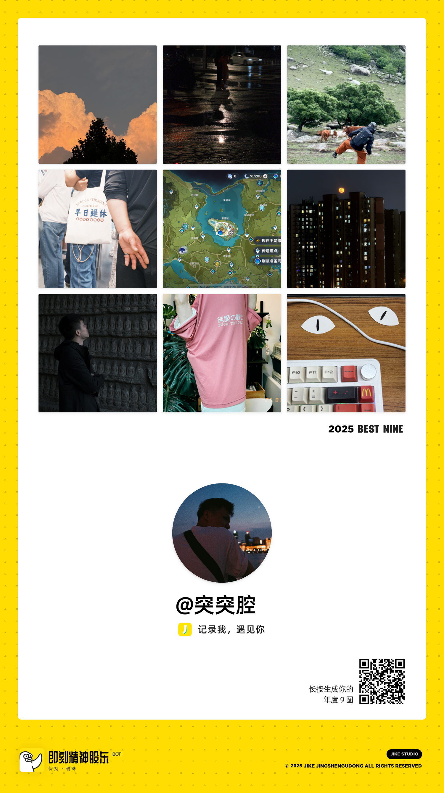看9图活动才直观感受发现今年在jike的活跃度指数降低。生活乏善可陈和分享羞耻。尤其前几天叽里咕噜说了一堆被朋友线下问候,表面冷静回应内心撞烂墙根,害羞到删掉。