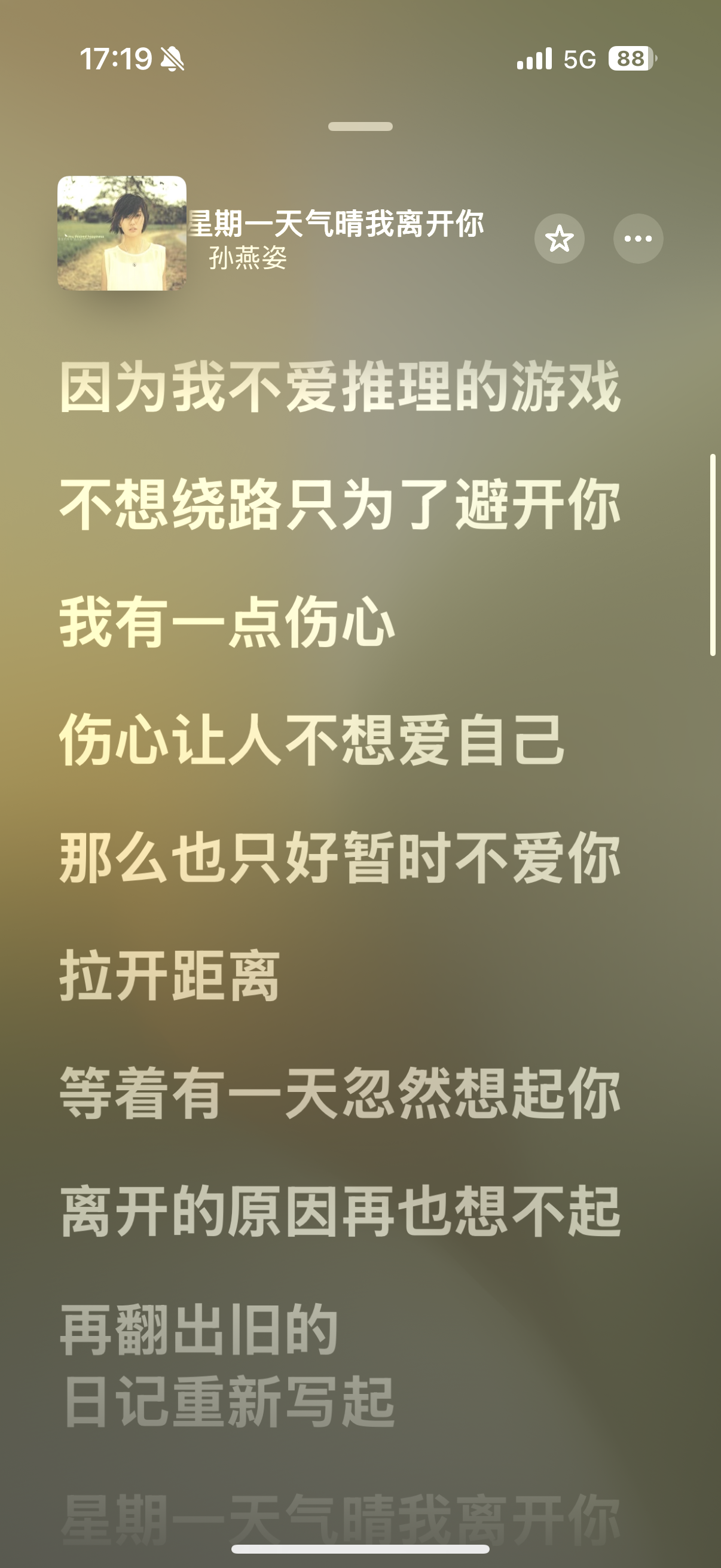 缺少写字的能力后,需要借助外力来表达和共鸣,所以最近认真听了很多歌词。有些几年前喜欢哼唧的歌,仔细听了几遍后会取消红心,有些之前觉得不够类型的歌却正好适合。