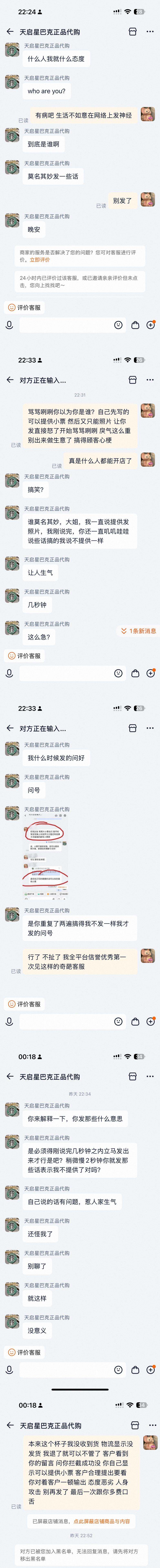我说你先回答 因为我之前购买的各种品牌官旗都是有小票的 你给我提供照片也行 对方突然就怒了 开始气急败坏骂骂咧咧 连发问号一顿输出 言语恶劣人身攻击