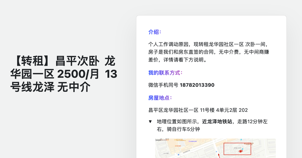 【转租】昌平次卧 龙华园一区 2500/月 13号线龙泽 无中介