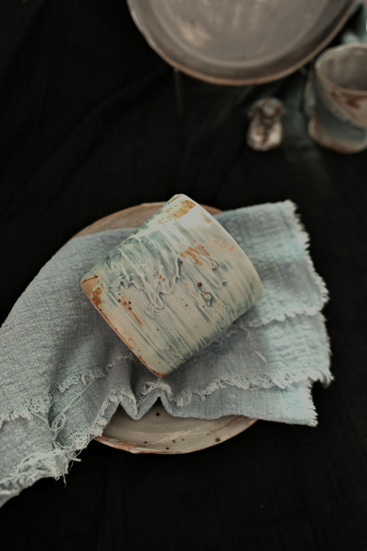 调了这份蓝色釉面以后,一直用来作为局部点缀的色彩,有天被询问说能不能做通体的蓝,当时我是有所犹豫的,一是关于釉面的特性,我没有十足的把握可以完全覆盖坯体而不出过度的瑕,二是对这份满釉的器缺少一些想象,即便客人给了很宽泛发挥的空间,也是悬着心接下了这份定制。