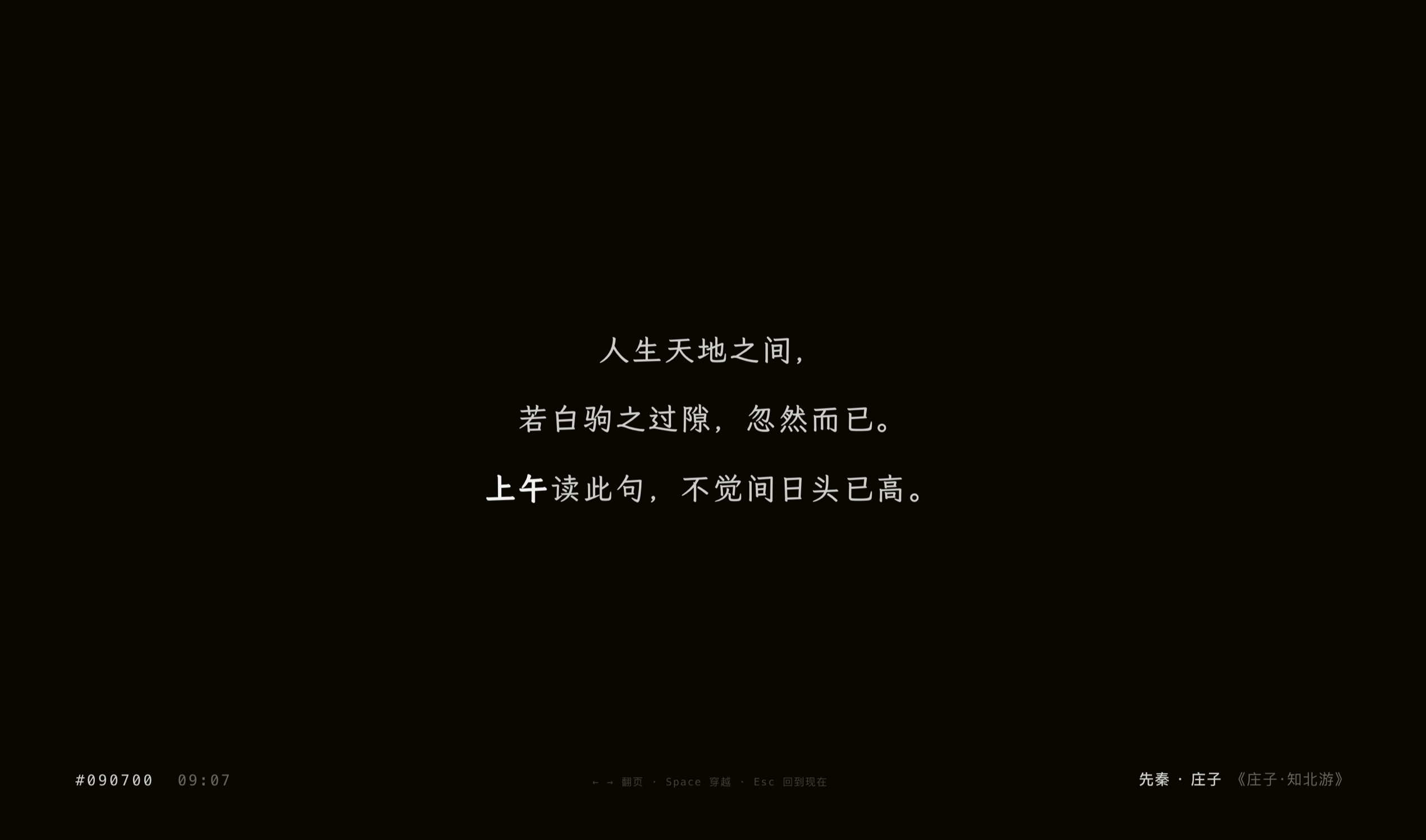 背景色也会跟着时间变化(HEX 十六进制色值),还做了一个「虫洞穿越」模式——按空格键,时间倒流,以引力加速度的动画在三分钟内快速闪回今天经过的每一分钟。