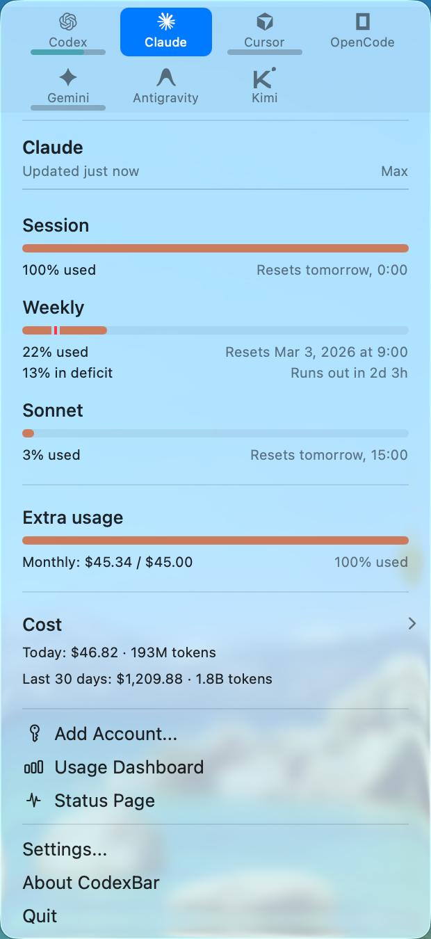 最近因为同时在用多个 AI Coding Agent 在做 Vibe Coding,其中 Claude Code 和 Codex 的五小时会话窗口用量管理是个挺痛的问题。在和 AI 搜索比较后,给我推荐了这个 macOS 端的窗口小工具 CodexBar。核心功能是实时监控多个 AI 编程工具的用量和配额,无需登录各平台 Web 端就可以同时看 5 小时的会话窗口用量、也能显示每周的用量进度。