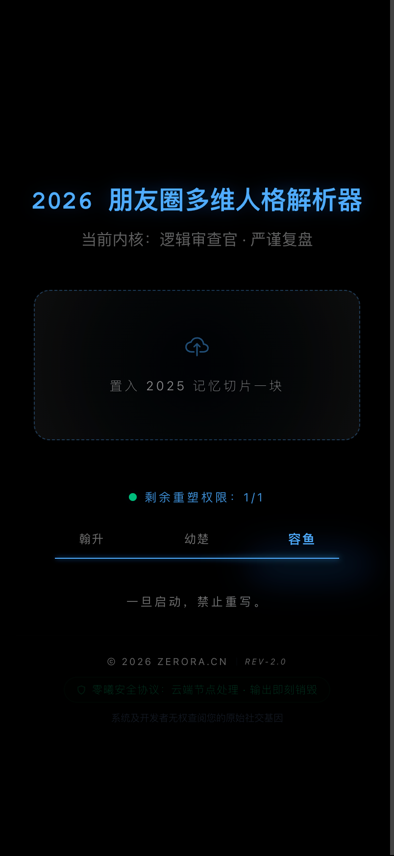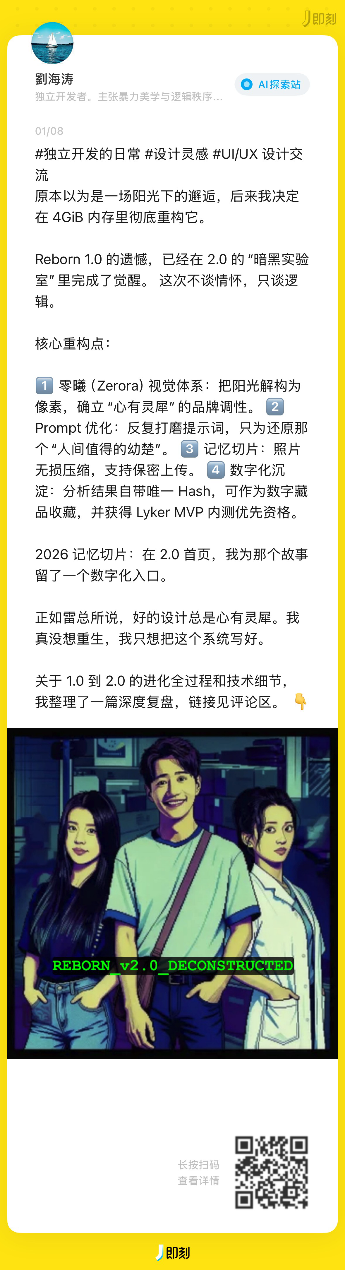 1️⃣ 零曦(Zerora)视觉体系:把阳光解构为像素,确立“心有灵犀”的品牌调性。 2️⃣ Prompt 优化:反复打磨提示词,只为还原那个“人间值得的幼楚”。 3️⃣ 记忆切片:照片无损压缩,支持保密上传。 4️⃣ 数字化沉淀:分析结果自带唯一 Hash,可作为数字藏品收藏,并获得 Lyker MVP 内测优先资格。