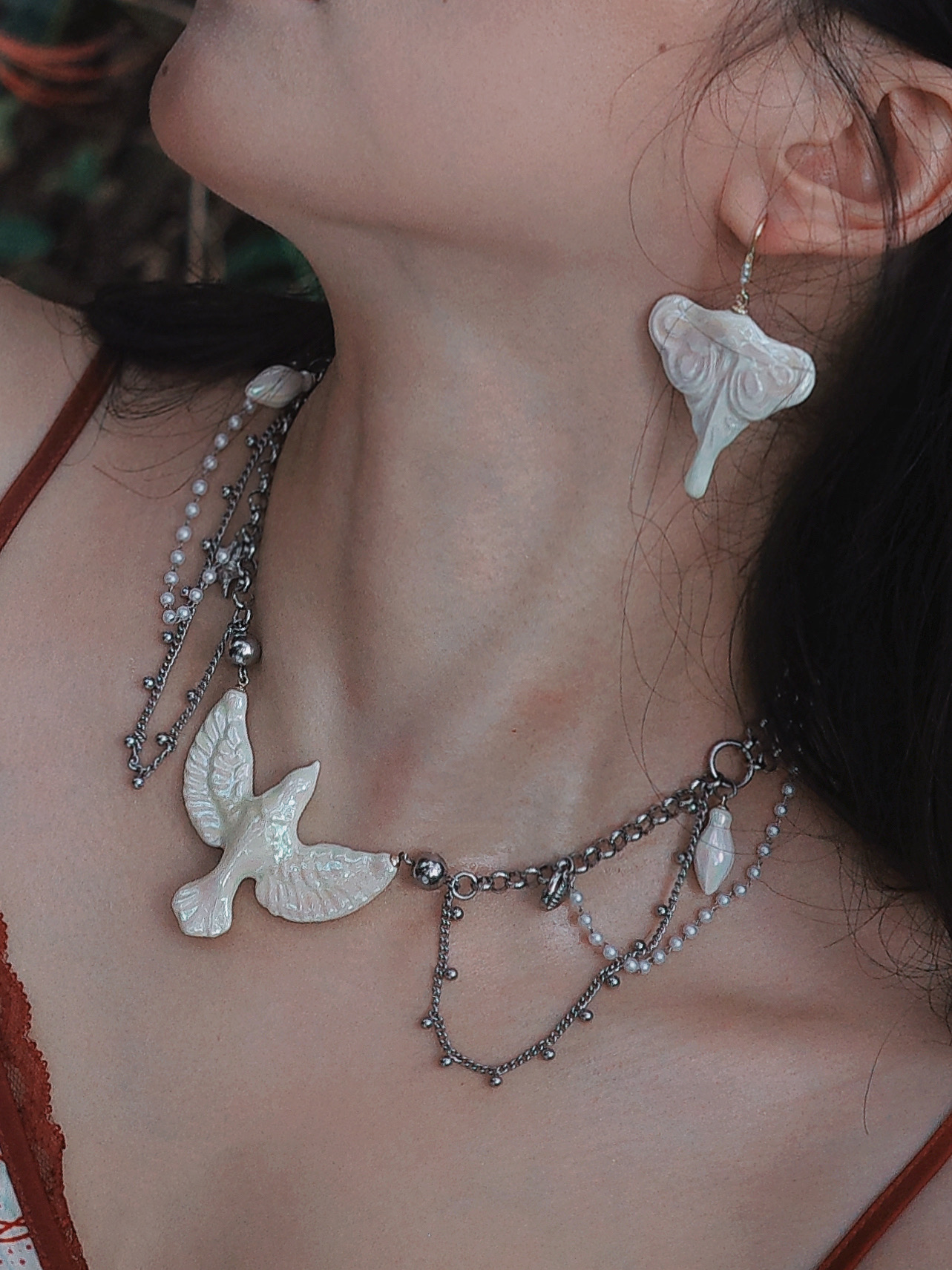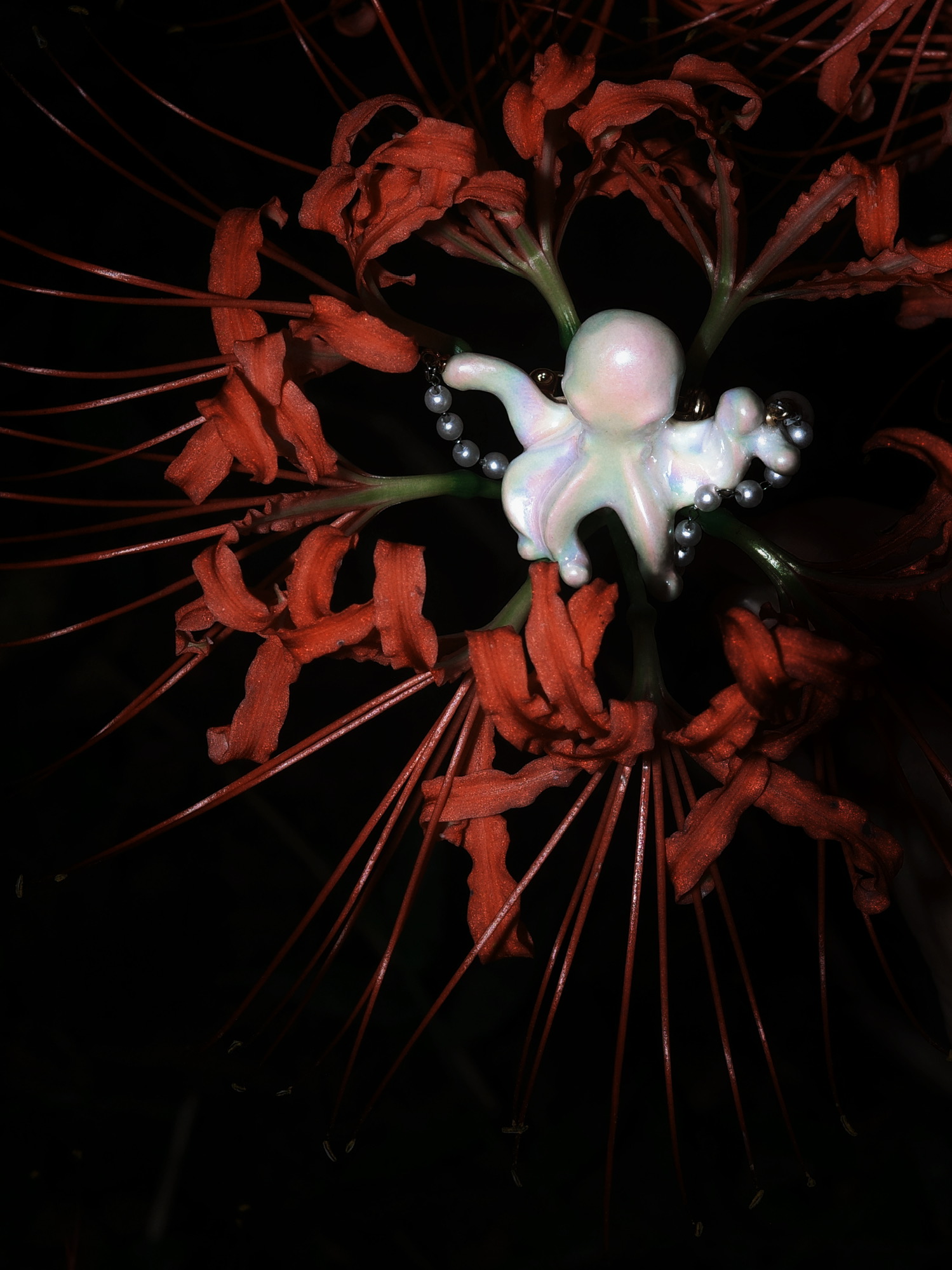 工作室门外,彼岸花肆意盛放,我们隐入这片绯红,佩戴「灵光礼赞」系列陶瓷首饰,完成一场光与火的对话。