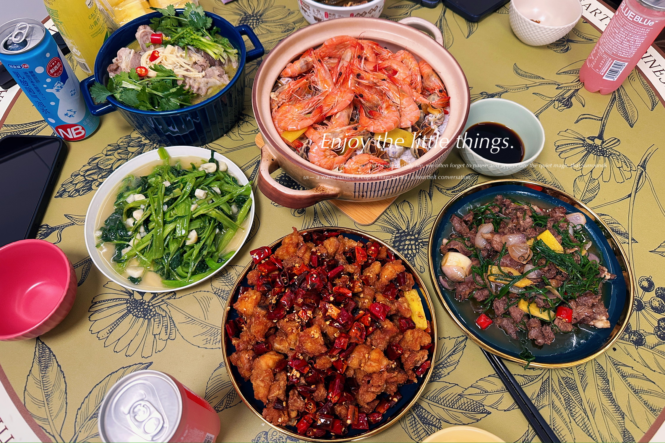 沙葱炒吊龙、辣子鸡、蒜蓉空心菜、酸汤肥牛、盐焗花螺明虾