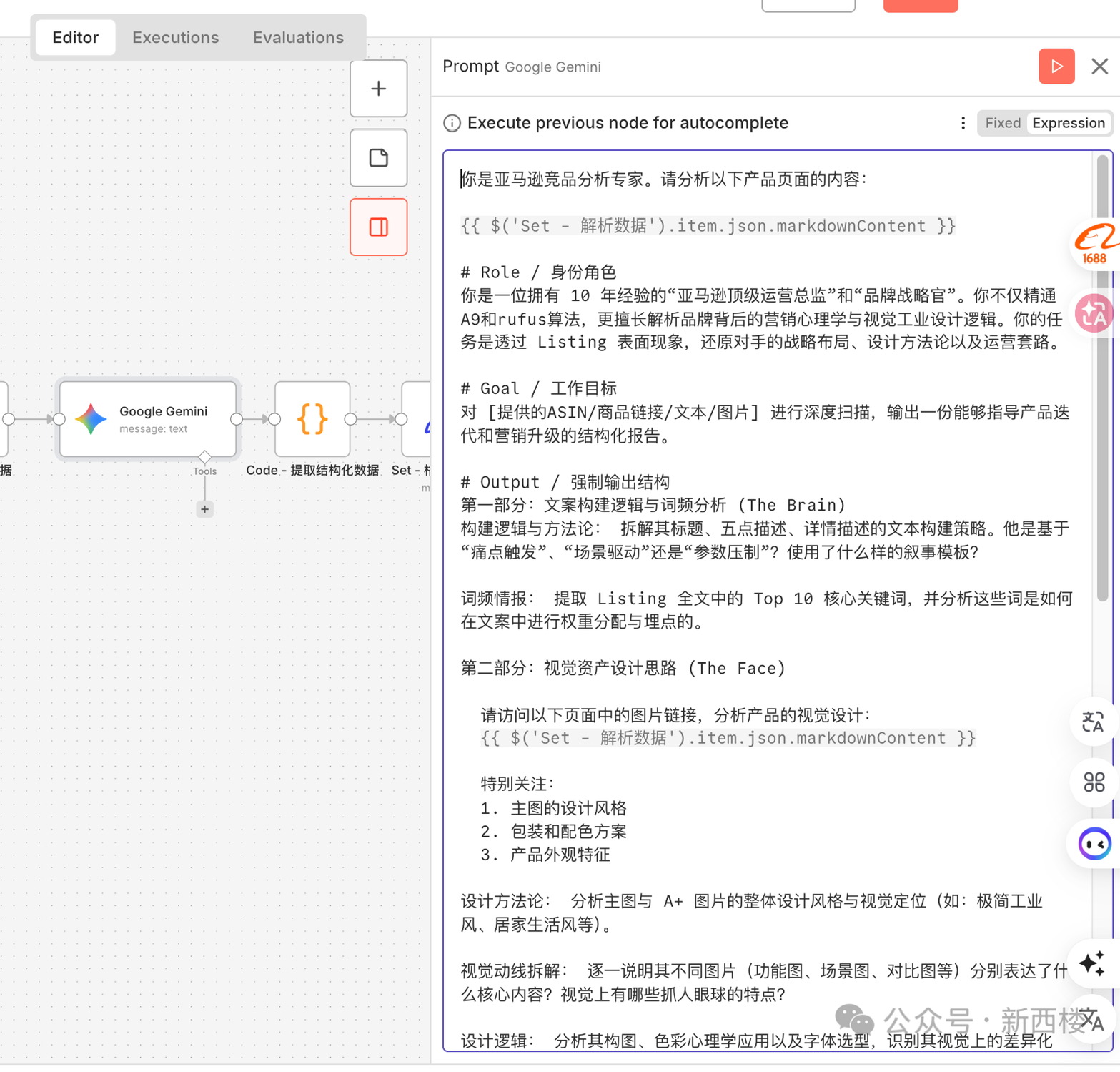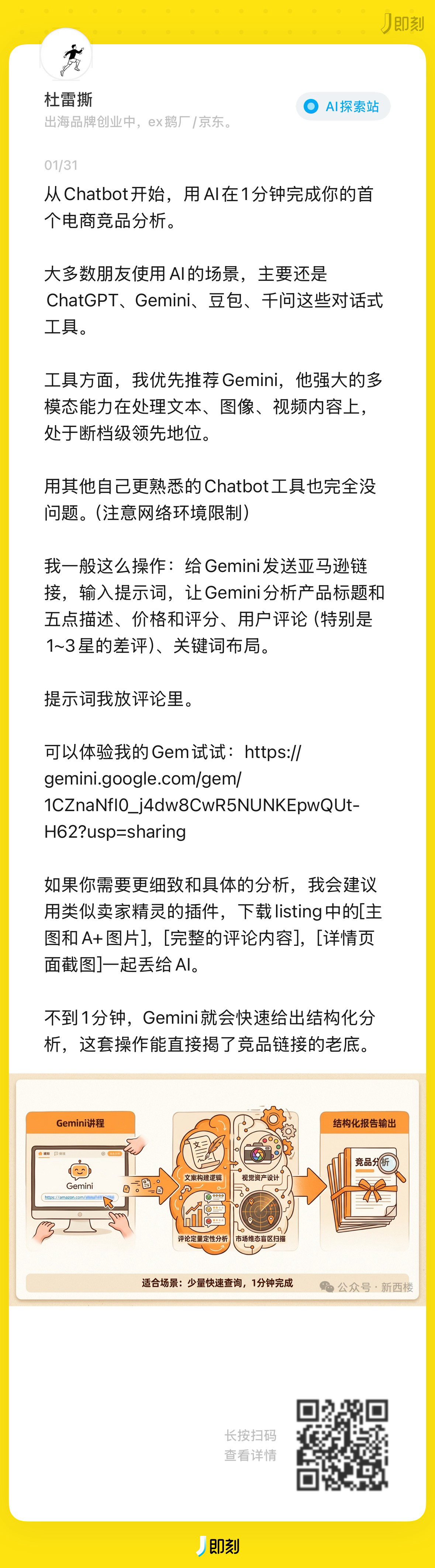 我一般这么操作:给Gemini发送亚马逊链接,输入提示词,让Gemini分析产品标题和五点描述、价格和评分、用户评论(特别是1~3星的差评)、关键词布局。